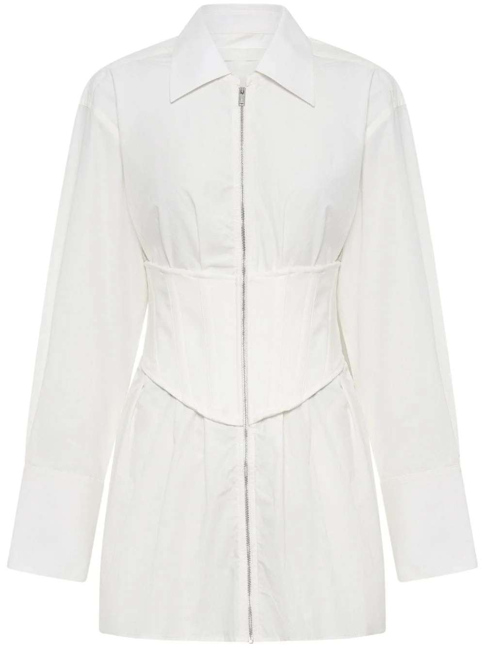 corset organic-cotton minidress Highlights - White - Organic cotton - Corset style - Classic collar - Long sleeves - Front zip fastening Imported Composition Body: Organic Cotton 100% SIZE & FIT Measurement HIPS 35.43 in(90 cm) LENGTH 31.1 in(79 cm) WAIST 24.4 in(62 cm) Washing instructions Dry Clean Only