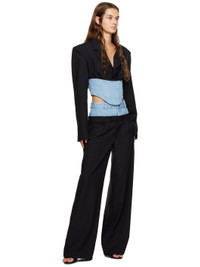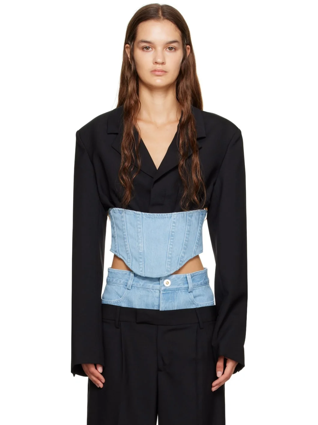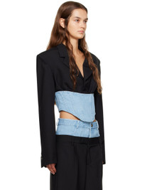 Plain-woven wool and non-stretch denim blazer. · Paneled construction · Peaked lapel · Concealed button closure · Gathering at chest · Boning at asymmetric cropped hem · Padded shoulders · Three-button surgeon's cuffs · Zip closure at back · Full plain-woven lining · Logo-engraved silver-tone hardware Supplier color: Black/Cyan