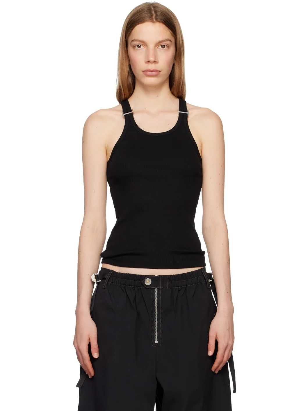 Rib knit stretch organic cotton tank top. · Crewneck · Silver-tone hook-eye at straps Supplier color: Black 98% organic cotton, 2% elastane. Made in Portugal 232417F111032