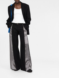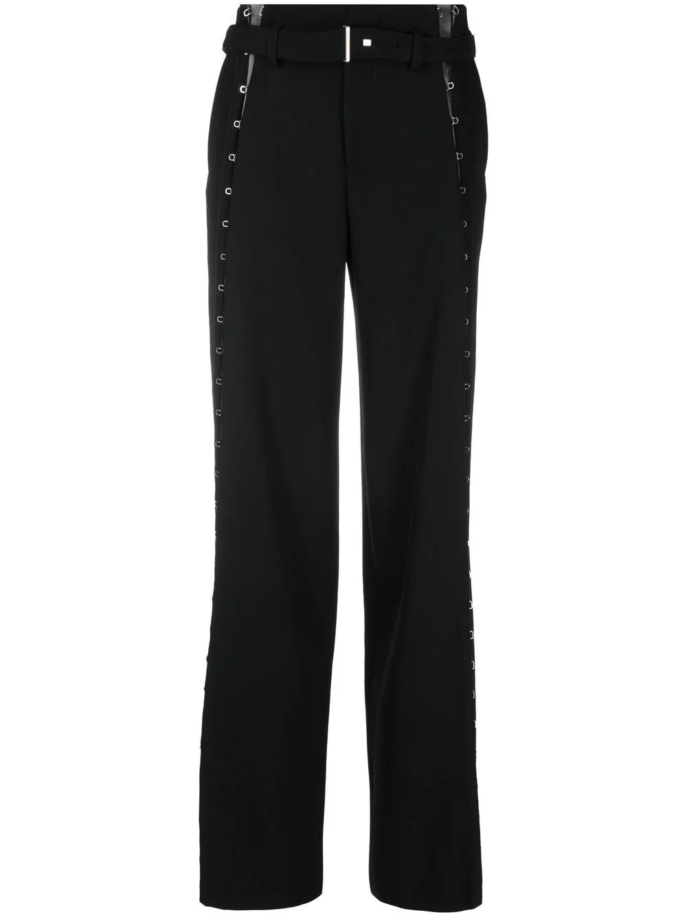 eyelet-detail wide-leg trousers Dion Lee utilises hook and eye fastenings in the design of these wool blend trousers. Belted at the waist, the hook detailing runs down the front of each leg, exaggerating the already sweeping wide-leg silhouette. Highlights - Black/silver-tone - Wool blend - High waist - Hook and zip fly fastening - Belted waist - Side pouch pockets - Two rear welt pockets - Hook detailing - Wide leg Made in Italy Composition Outer: Viscose 100%, Polyester 55%, Wool 45% Lining: Cotton 50%, Polyester 45%, Spandex/Elastane 5% SIZE & FIT Model measurements Height 5 ft 10 in(1.77 m) Bust/Chest 32.28 in(82 cm) Hips 35.03 in(89 cm) Waist 25.19 in(64 cm) FittingInformation This piece fits true to size. We recommend you get your regular size Designed to be fitted at the waist and hips, loose over the leg Made with a mid-weight fabric