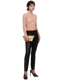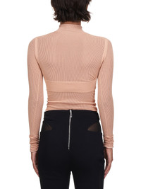 Dion Lee top in beige, mock neck collar with raw/unfinished edge, long sleeves, unfinished/raw cuff edges, all over mesh design, elasticized bralette detail with bust underwire, tonal stitching. Made in China. Standard XS-L Sizing. Composition - 57% Viscose, 24% Nylon, 15% Polyester, 4% Elastane. Model Measurements: Model is 5ft 7” and wearing a size XS. Bust: 32” Waist: 24” Hip: 34"