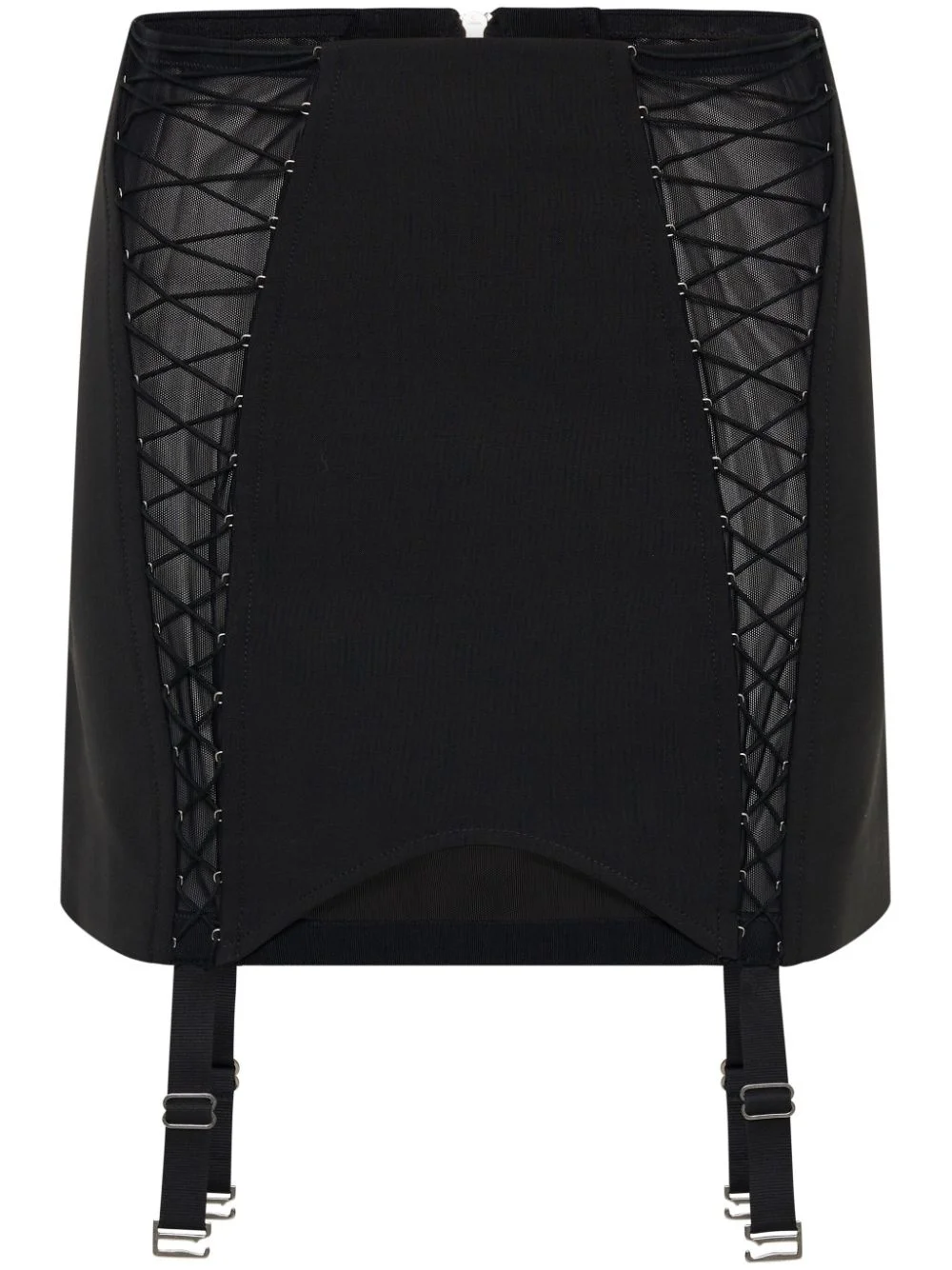 lace-up sheer miniskirt black stretch-design front lace-up fastening sheer rear zip fastening thigh-length straight hem Imported Composition Outer: Polyester 52%, Wool 41%, Elastane 4%, Polyamide 3% Lining: Viscose 100%