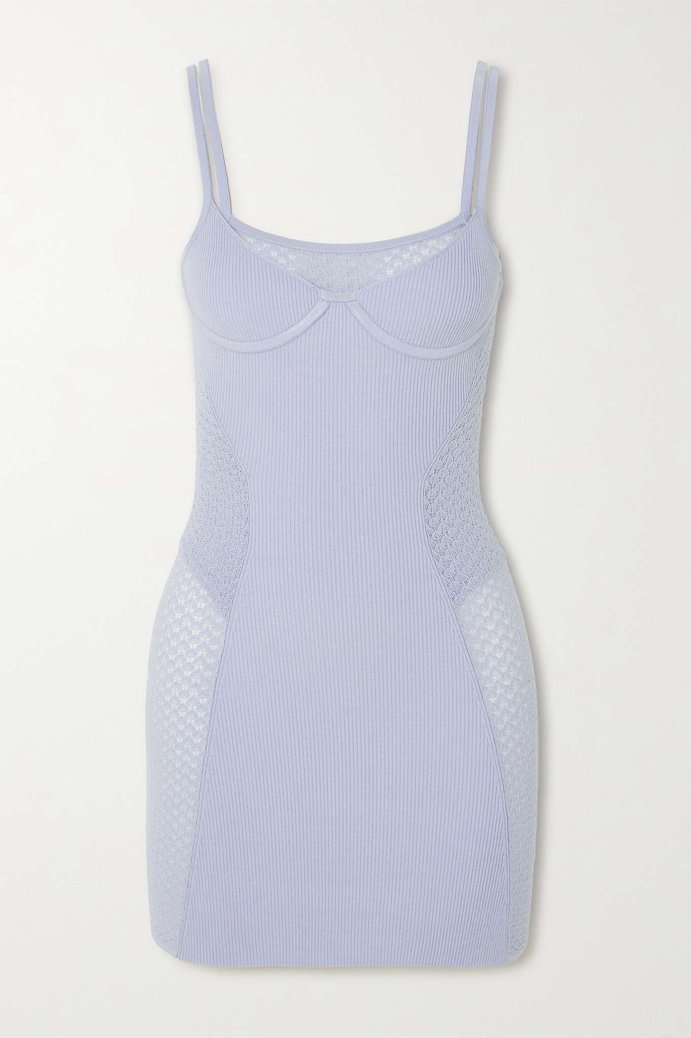 EDITORS'NOTES Borrowing elements from classic lingerie, Dion Lee's mini dress is underpinned with a high-cut bodysuit to balance the sheerness. It's made from ribbed stretch-jersey and has contrasting pointelle-knit panels that highlight the hourglass shape. Wear yours with barely-there heels. SIZE & FIT - Fits true to size, take your normal size - Intended for a close fit - Particularly short in length - Lightweight, stretchy fabric - Model is 180cm/ 5’11” and is wearing a size Small DETAILS & CARE - Lilac pointelle-knit and stretch-jersey - Snap fastenings at base - Fabric1: 79% viscose, 21% polyester; fabric2: 57% viscose, 22% nylon, 17% polyester, 4% elastane - Dry clean - Designer color: Glacier
