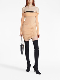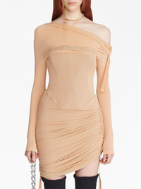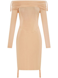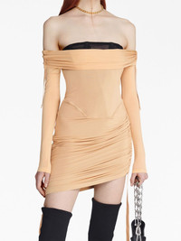 off-shoulder gathered minidress Highlights - Sandstone - Stretch-design - Gathered detailing - Corset style - Side drawstring fastening - Off-shoulder - Long sleeves - Thigh-length Imported Composition Body: Viscose 86%, Elastane 14% Washing instructions Dry Clean Only