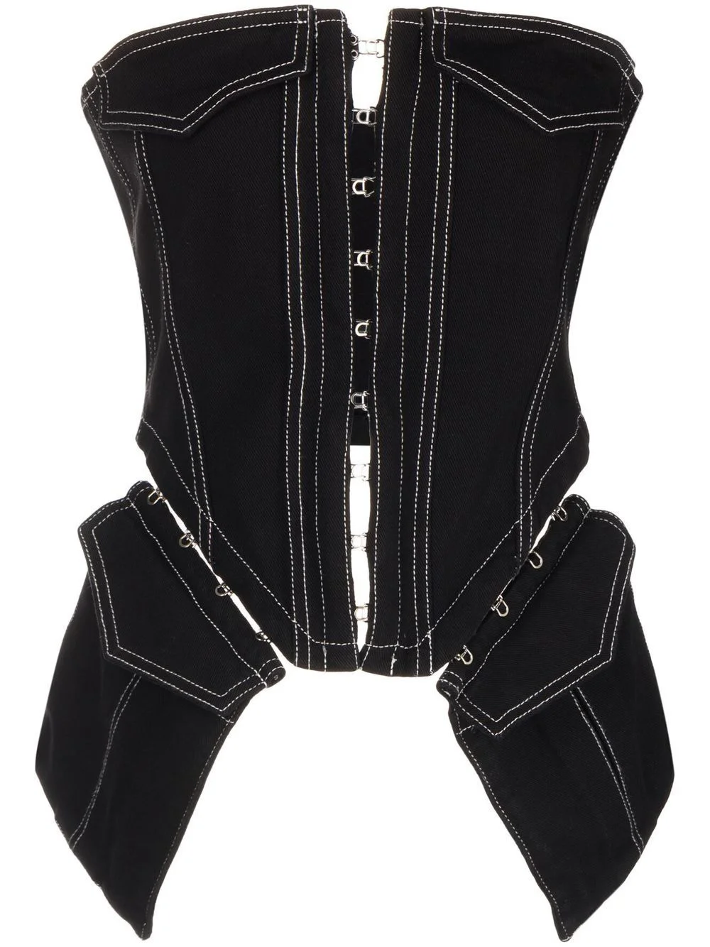 pocket denim corset black cotton denim strapless corset style contrast stitching square neck front hook and eye fastening two chest flap pockets two front cargo pockets cropped Imported Composition Body: Cotton 100% SIZE & FIT Model measurements Height 5 ft 11 in(1.8 m) Bust/Chest 28.34 in(72 cm) Hips 35.43 in(90 cm) Waist 23.62 in(60 cm) FittingInformation This piece fits true to size. We recommend you get your regular size Cut for a close fit Made with a mid-weight fabric