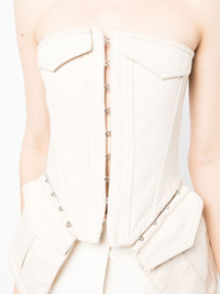 pocket denim corset cream white cotton denim corset style contrast stitching front hook and eye fastening square neck chest flap pockets two side flap pockets cropped Imported Composition Body: Cotton 100% SIZE & FIT Model measurements Height 5 ft 11 in(1.8 m) Bust/Chest 28.34 in(72 cm) Hips 35.43 in(90 cm) Waist 23.62 in(60 cm)