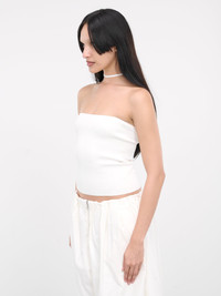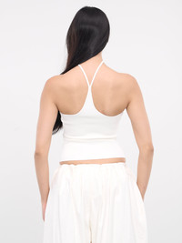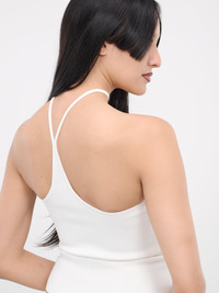 DION LEE top in white, tank top design, viscose-nylon blend, paneled construction, reverse halterneck, straight neckline, sleeveless, straight hem, slim fit. 65% Viscose 34% Nylon 1% Elastane Standard Sizing Model is 5'8" wearing size S. Bust: 32" Waist: 26" Hips: 34.5"