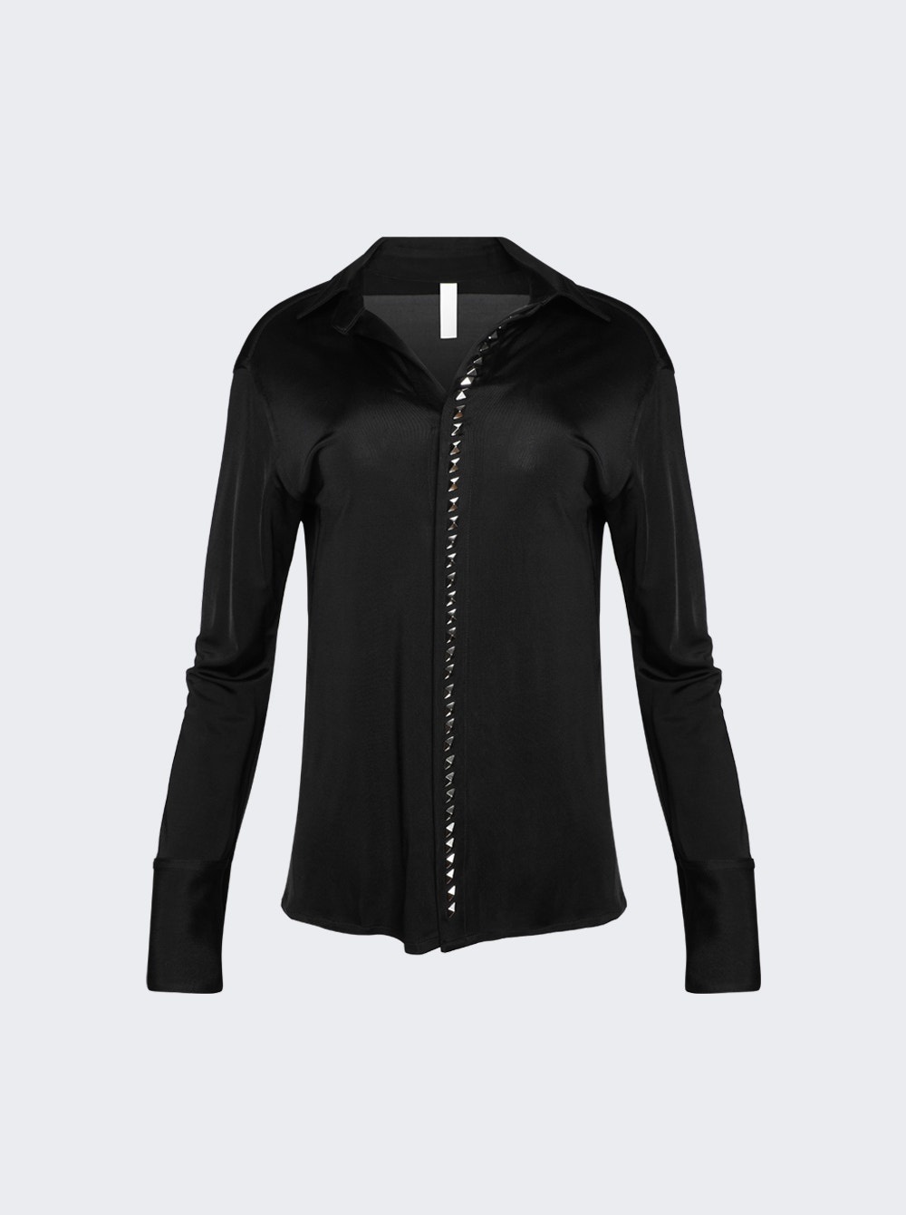 Details - Long sleeve - Fabrication has a luxe, slinky hand and drapes over the body - Detailed with diamond pyramid studs along center front concealed placket. - Point collar and wide two-button cuff - Cut for a relaxed fit Dimensions: Model is 5'9"/175cm and is wearing a size S Composition: 100%Viscose Care: Care according to label Brand Style: C5043PS24-1000 Designer/Brand: DION LEE