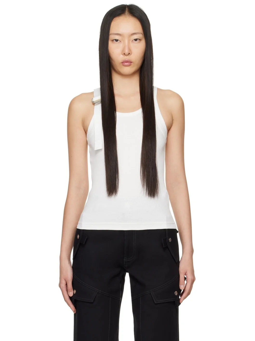 Ribbed stretch organic cotton jersey tank top. · Scoop neck · Webbing cinch strap at shoulder · Logo hardware at cinch strap · Racer back · Silver-tone hardware Supplier color: Ivory 98% organic cotton, 2% elastane. Made in Portugal 241417F111053