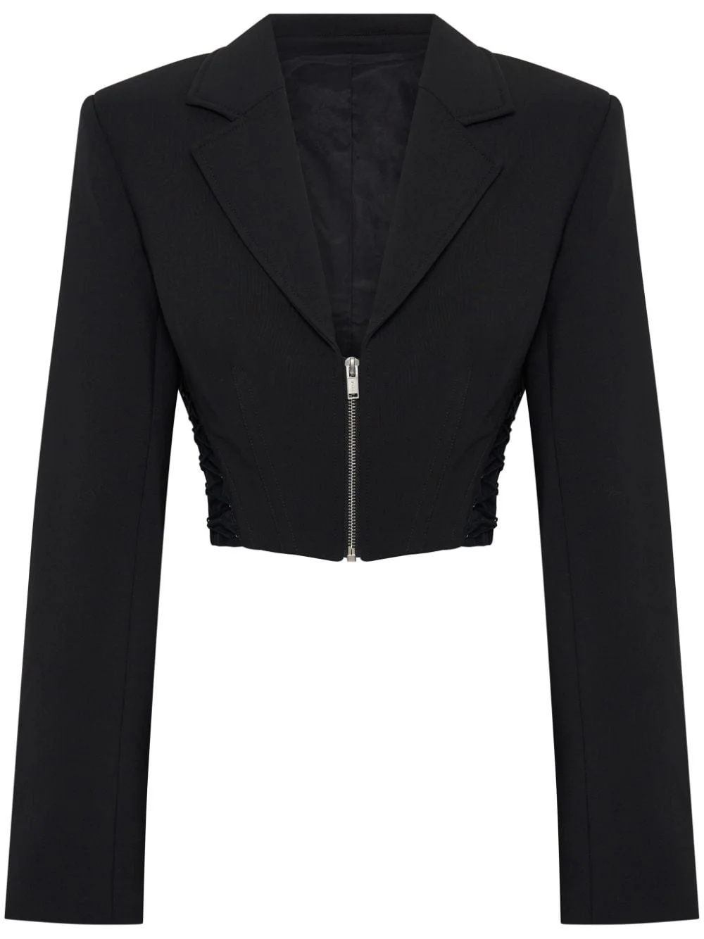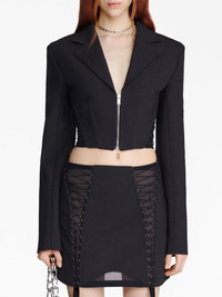 zipped cropped blazer Highlights - Black - Cotton blend - Front zip fastening - Corset style - Peak lapels - Long sleeves - Cropped - Straight hem Imported Composition Outer: Polyester 52%, Wool 41%, Polyamide 3% Lining: Cotton 64%, Nylon 36% Washing instructions Dry Clean Only