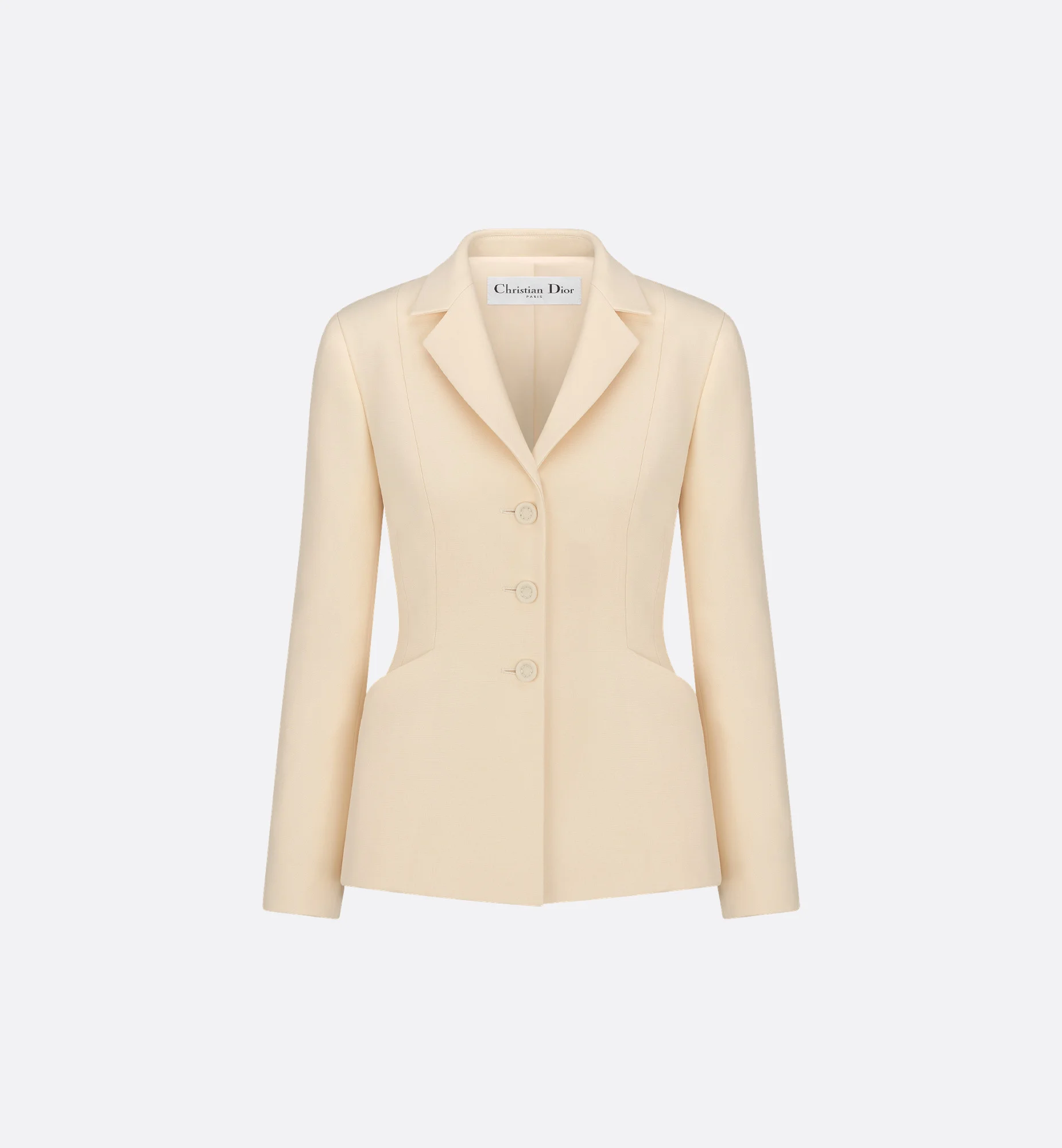 The Bar Jacket is an emblematic style from the New Look collection, first created by Christian Dior in 1947. Reimagined by Maria Grazia Chiuri, the silhouette is crafted in a lightweight blend of white wool and silk. It features notch lapels and welt pockets that delicately highlight the waist. The Bar Jacket pairs well with the entire Dior wardrobe for an elegant and refined look. - Flattering shape, structured yet supple construction - Notch lapels - Single-breasted three-button front - 100% crepe de Chine silk lining - 77% wool, 23% silk - Made in France Size & Fit - Fitted silhouette - Size 34: shoulder-to-shoulder width: 34 cm / 13.5 inches, chest size: 78 cm / 30.5 inches, outside and inside sleeve lengths: 59 and 42 cm / 23 and 16.5 inches, garment length: 61 cm / 24 inches - Size 36: shoulder-to-shoulder width: 35 cm / 14 inches, chest size: 82 cm / 32.5 inches, outside and inside sleeve lengths: 60 and 42 cm / 23.5 and 16.5 inches, garment length: 62 cm / 24.5 inches - Size 38: shoulder-to-shoulder width: 36 cm / 14 inches, chest size: 86 cm / 34 inches, outside and inside sleeve lengths: 61 and 42 cm / 24 and 16.5 inches, garment length: 63 cm / 25 inches - Size 40: shoulder-to-shoulder width: 37 cm / 14.5 inches, chest size: 90 cm / 35.5 inches, outside and inside sleeve lengths: 62 and 43 cm / 24.5 and 17 inches, garment length: 64 cm / 25 inches - Size 42: shoulder-to-shoulder width: 38 cm / 15 inches, chest size: 94 cm / 37 inches, outside and inside sleeve lengths: 63 and 44 cm / 25 and 17.5 inches, garment length: 65 cm / 25.5 inches - Size 44: shoulder-to-shoulder width: 39 cm / 15.5 inches, chest size: 98 cm / 38.5 inches, outside and inside sleeve lengths: 63 and 44 cm / 25 and 17.5 inches, garment length: 66 cm / 26 inches - Size 46: shoulder-to-shoulder width: 40 cm / 15.5 inches, chest size: 102 cm / 40 inches, outside and inside sleeve lengths: 64 and 45 cm / 25 and 17.5 inches, garment length: 67 cm / 26.5 inches - Size 48: shoulder-to-shoulder width: 41 cm / 16 inches, chest size: 106 cm / 41.5 inches, outside and inside sleeve lengths: 64 and 45 cm / 25 and 17.5 inches, garment length: 68 cm / 27 inches - We recommend ordering a size larger than your regular size for a more comfortable fit - Each measurement may have a normal variation of 2 cm / 0.75 inch - Using our personalized tool will provide you with the best size recommendation - For more information, please review the size guide