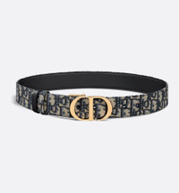 Inspired by the hallmark namesake bag, the 30 Montaigne belt is offered in a reversible variation, thanks to its swivel mechanism. Crafted in blue smooth calfskin on one side and blue Dior Oblique jacquard on the other, it is embellished with the iconic CD buckle in shiny gold-finish metal. The design also features two removable loops that can be worn in a tonal or contrasting fashion. The timeless accessory elegantly highlights the waist and will coordinate well with jeans, a skirt or a dress. - 30 Montaigne CD buckle - Shiny gold-finish metal detailing - Two removable loops - 40% calfskin, 40% cotton, 10% brass, 5% polyamide, 5% polyester - Made in Italy Size & Fit - Width: 35 mm / 1.4 inches - Using our personalized tool will provide you with the best size recommendation - For more information, please review the size guide