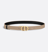 Inspired by the hallmark namesake bag, the 30 Montaigne belt is offered in a reversible variation, thanks to its swivel mechanism. Crafted in hazelnut smooth calfskin on one side and black smooth calfskin on the other, it is embellished with the iconic CD buckle in shiny gold-finish metal. The design also features two removable loops that can be worn in a tonal or contrasting fashion. The timeless accessory elegantly highlights the waist and will coordinate well with jeans, a skirt or a dress. - 30 Montaigne CD buckle - Shiny gold-finish metal detailing - Two removable loops - 95% calfskin, 5% brass - Made in Italy Size & Fit - Width: 20 mm / 0.8 inch - Buckle dimensions: 4 x 2.5 cm / 1.5 x 1 inches (Length x Height) - Using our personalized tool will provide you with the best size recommendation - For more information, please review the size guide