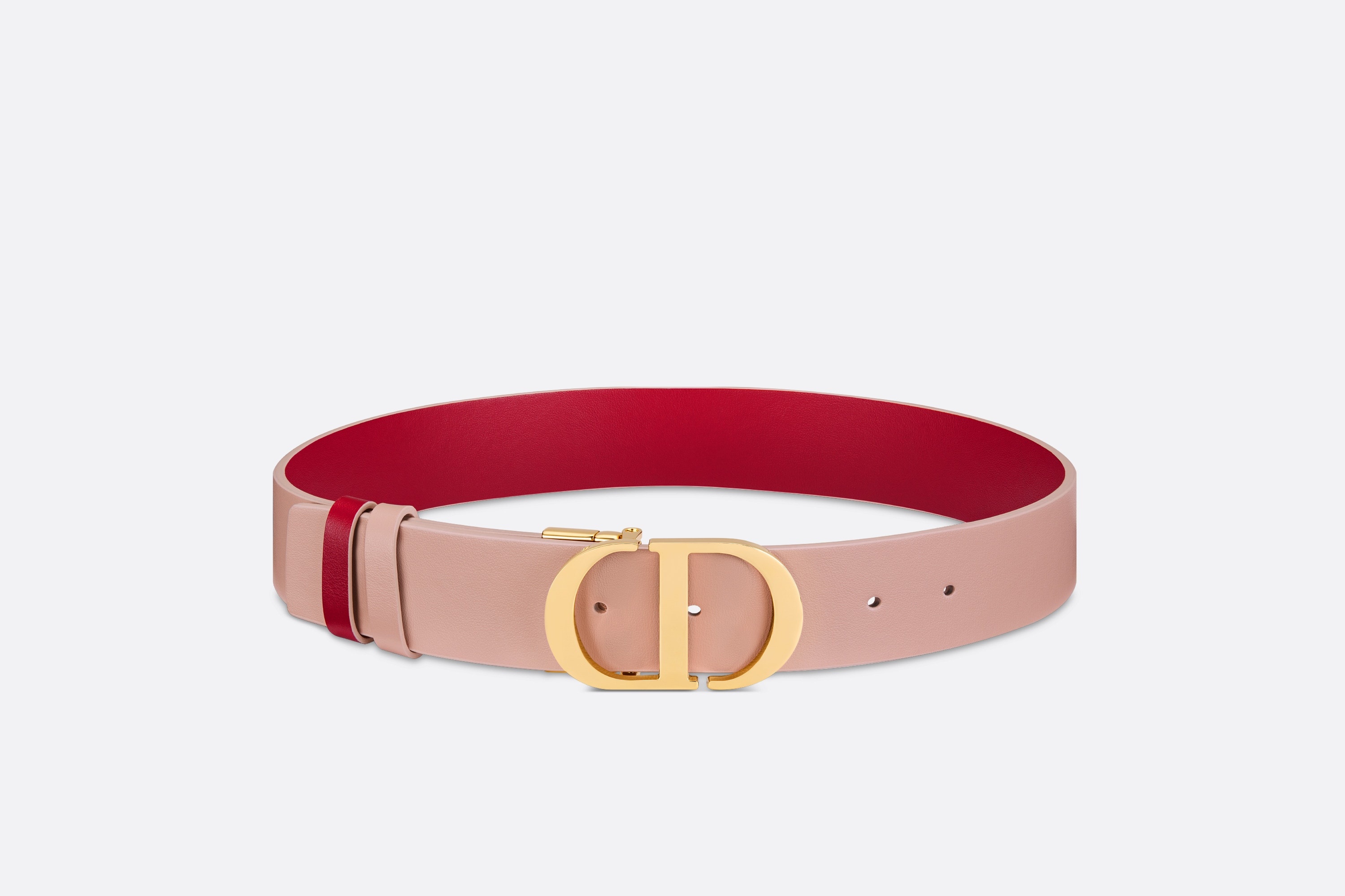 Inspired by the hallmark namesake bag, the 30 Montaigne belt is offered in a reversible variation, thanks to its swivel feature. Crafted in nude smooth calfskin on one side and amaryllis red on the other, it is embellished with the iconic shiny gold-finish metal CD buckle. The design also features two removable loops that can be worn in an either tonal or contrasting fashion. The timeless accessory elegantly highlights the waist and will pair effortlessly with jeans, a skirt or a dress. - 30 Montaigne CD buckle - Shiny gold-finish metal detailing - Two removable loops - 100% calfskin - Made in Italy Size & Fit - Width: 35 mm / 1.4 inches - Using our personalized tool will provide you with the best size recommendation - For more information, please view the size guide