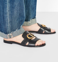 The 30 Montaigne slide is an essential Dior wardrobe piece. The gold-finish metal 'CD' signature highlights the silhouette and contrasts with the black calfskin. Its timeless and elegant design pairs easily with many styles. - Gold-finish metal 'CD' signature - Tonal edge dye - Leather sole with star, Christian Dior's lucky symbol - Made in Italy Size & Fit - This model fits as expected: we recommend ordering your normal shoe size - For those with wider feet, we recommend ordering a half-size bigger than your normal size - For more information, please view the size guide