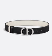 Inspired by the hallmark namesake bag, the 30 Montaigne belt is offered in a reversible variation, thanks to its swivel mechanism. Crafted in black smooth calfskin on one side and white smooth calfskin on the other, it is embellished with the iconic CD buckle in palladium-finish metal. The design also features two removable loops that can be worn in a tonal or contrasting fashion. The timeless accessory elegantly highlights the waist and will coordinate well with a skirt or dress. - 30 Montaigne CD buckle - Palladium-finish metal detailing - Two removable loops - 90% calfskin, 10% brass - Made in Italy Size & Fit - Width: 35 mm / 1.4 inches - Using our personalized tool will provide you with the best size recommendation - For more information, please review the size guide