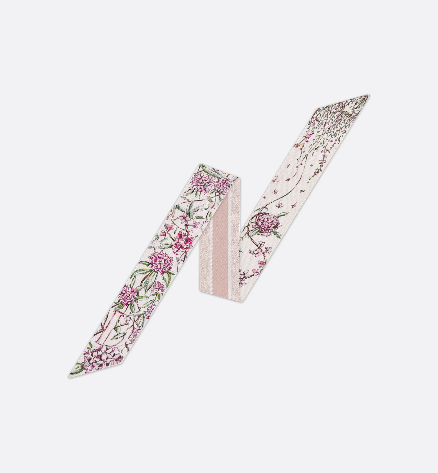 The ABCDior Mitzah scarf, crafted in silk twill, showcases one of 26 flowers that represent Christian Dior's love of nature. A passion that flourishes like never before upon Maria Grazia Chiuri's delicate creations in a celebration of botanical beauty. To escape from their senescence, fine entangled branches draw the silky hair of Daphne while evaporating in a diaphanous profusion of flowers. Enhanced by a contrasting Christian Dior signature jacquard band on the back, the ivory multicolor Mitzah scarf adds the finishing touch to any look and may be tied around the neck, at the wrist or on a bag. - ABCDior print - Letter D Daphne - Daphne - Contrasting jacquard band with Christian Dior signature on back - Pointed ends - 100% silk twill - Made in Italy - Sold with leaflet Size & Fit - Dimensions: 6 x 105 cm / 2.5 x 41.5 inches