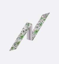 The ABCDior Mitzah scarf, crafted in silk twill, showcases one of 26 flowers that represent Christian Dior's love of nature. A passion that flourishes like never before upon Maria Grazia Chiuri's delicate creations in a celebration of botanical beauty. When evening comes, the meadow hides its rarest treasures, and only luck can reveal the four-leaf clovers at sunset. Enhanced by a contrasting Christian Dior signature jacquard band on the back, the ivory multicolor Mitzah scarf adds the finishing touch to any look and may be tied around the neck, at the wrist or on a bag. - ABCDior print - Letter Q Quadrilobe - Quand Vient le Soir - Contrasting jacquard band with Christian Dior signature on back - Pointed ends - 100% silk twill - Made in Italy - Sold with leaflet Size & Fit - Dimensions: 6 x 105 cm / 2.5 x 41.5 inches