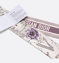 The ABCDior Mitzah scarf, crafted in silk twill, showcases one of 26 flowers that represent Christian Dior's love of nature. A passion that flourishes like never before upon Maria Grazia Chiuri's delicate creations in a celebration of botanical beauty. Perfume of violets in the air. The birds of paradise have left the cage that sheltered them, and by raising our eyes to the sky, we see them flying freely between the branches of tall secular trees. Enhanced by a contrasting Christian Dior signature jacquard band on the back, the ivory multicolor Mitzah scarf adds the finishing touch to any look and may be tied around the neck, at the wrist or on a bag. - ABCDior print - Letter V Violette - Voler - Contrasting jacquard band with Christian Dior signature on back - Pointed ends - 100% silk twill - Made in Italy - Sold with leaflet Size & Fit - Dimensions: 6 x 105 cm / 2.5 x 41.5 inches