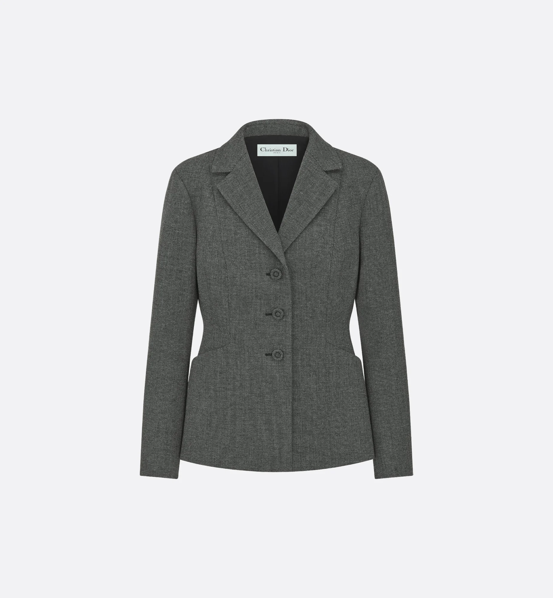 The Bar jacket is an emblematic style from the New Look collection, first created by Christian Dior in 1947. Reimagined by Maria Grazia Chiuri, the silhouette is crafted in lightweight gray wool tweed, and is characterized by a notched collar and slit pockets that delicately highlight the waist. The Bar jacket can be paired with the matching pants or any other pieces from the Dior wardrobe for an elegant and refined look. - Flattering shape, structured yet supple construction - Handsewn topstitching - Notch lapels - Single-breasted with three buttons - Black silk lining - 100% wool and lining: 100% silk - Made in France Size & Fit - Fitted silhouette - Long sleeves - Using our personalized tool will provide you with the best size recommendation - For more information, please review the size guide
