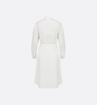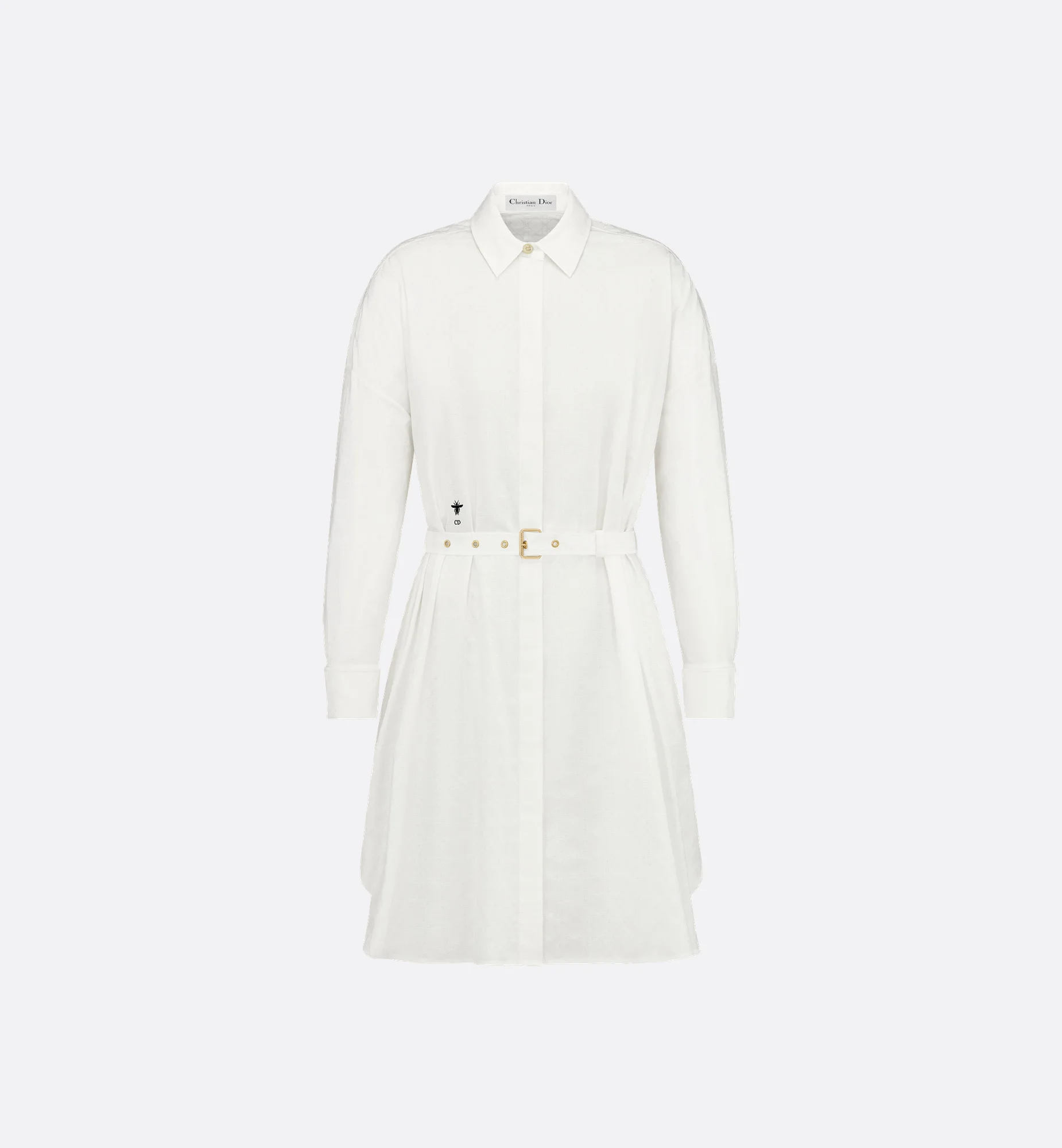 The belted shirtdress transcends House codes of modern elegance. Crafted in white Macrocannage cotton gabardine, it features a flared silhouette elevated by a removable tonal belt highlighting the waist. The collar and cuffs are embellished with Dior Tribales buttons, showcasing a CD resin pearl inspired by the iconic House earring. The shirtdress will create a refined outfit. - Removable tonal belt with metal buckle - Concealed front button closure - Christian Dior Paris mother-of-pearl buttons - Neckline and cuffs with Dior Tribales buttons - Unlined - 100% cotton - Made in Italy - We recommend removing the accessories before cleaning Size & Fit - Flared cut - Knee-length - Long sleeves - Using our personalized tool will provide you with the best size recommendation - For more information, please review the size guide
