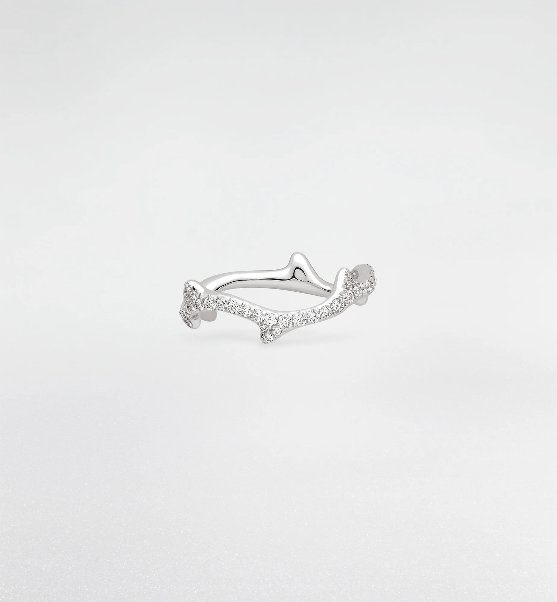 More modern than ever, the Bois de Rose Collection pays homage to Christian Dior's favorite flower, the rose, by reinterpreting its stem in a stunning abstraction. Punctuated with golden or diamond thorns, it wraps delicately around the finger, wrist or ear as a symbol of attachment. - 18K white gold - Diamonds (0.58 ct*) Size & Fit - Given the ring's irregular design, we recommend ordering a size smaller than your regular size - You may refer to the size guide on the website - For more information on sizing, we invite you to visit to a boutique - To create a unique look, Bois de Rose rings can be paired with each other - The Bois de Rose ring can be complemented by rings from the Rose Dior Couture Collection