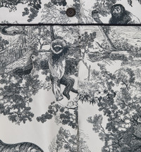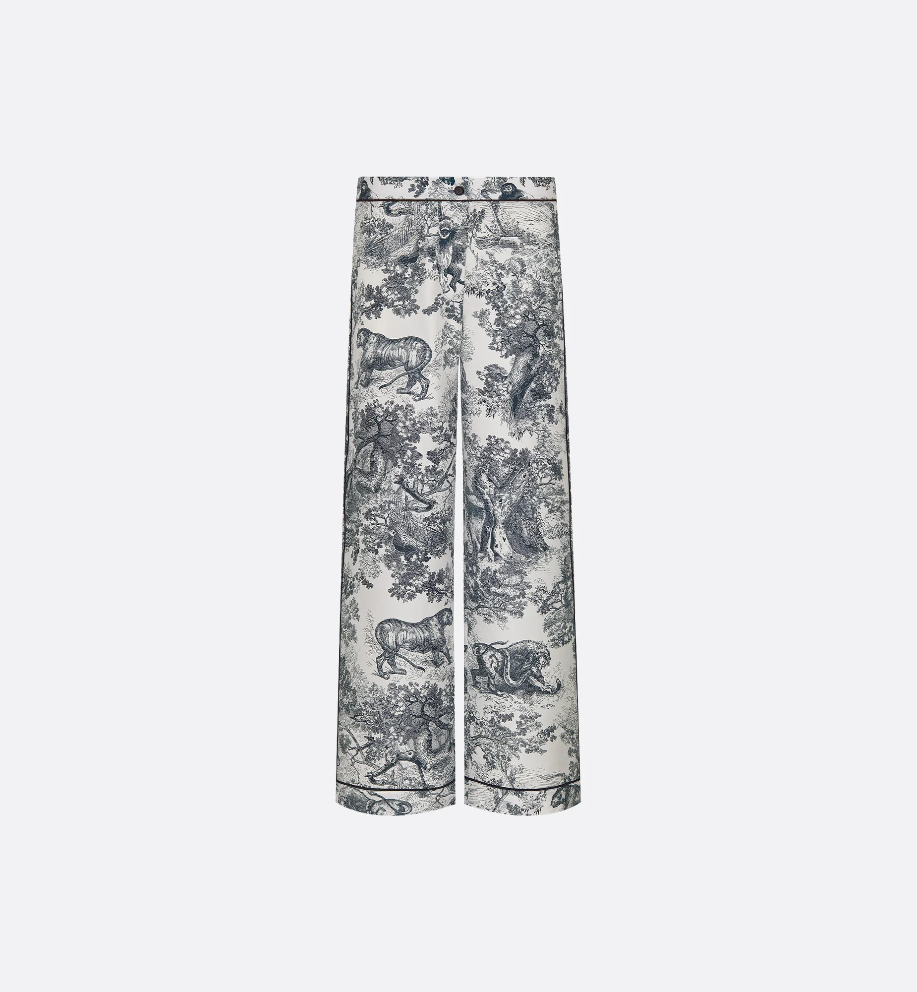 The Dior Chez Moi pants feature the emblematic Toile de Jouy motif. Crafted in white and navy blue silk twill, they are embellished with black piping for an elegant contrast and a back pocket. The lightweight and refined pants can be worn with the matching jacket to complete the look. - Black piping details - Front button closure - Christian Dior Paris signature horn buttons - Unlined - 100% silk - Made in Italy Size & Fit - Relaxed fit - Mid-rise waist - Length: 96.5 cm / 38 inches (size 38) - Using our personalized tool will provide you with the best size recommendation - For more information, please review the size guide