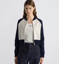 The sportswear bomber jacket is reimagined in a variation made with the 'CHRISTIAN DIOR 8' lettering on the back. Crafted in ecru and blue technical wool knit, the design boasts raglan sleeves. The bomber jacket will lend a relaxed touch to any of the season's looks. - 'CHRISTIAN DIOR 8' lettering on back - Front zip closure - Ribbed collar, cuffs and hem - 86% wool, 7% polyamide, 7% acrylic (12-gauge)* - Made in Italy Size & Fit - Fitted silhouette - Back length: 47 cm / 18.5 inches (size M) - Long sleeves - For more information, please review the size guide