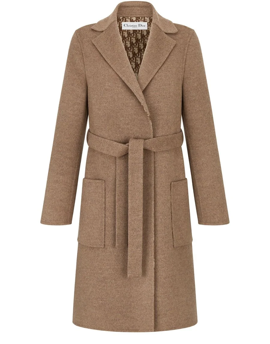DESCRIPTION - Oblique interior - CHRISTIAN DIOR' signature band on the interior - Tonal belt to tie - Unlined DETAILS AND CARE MATERIAL: 99% virgin wool, 1% silk COLOR: marron COUNTRY OF MANUFACTURE: Italy PRODUCT CODE: DIO49699BRW7E11A00