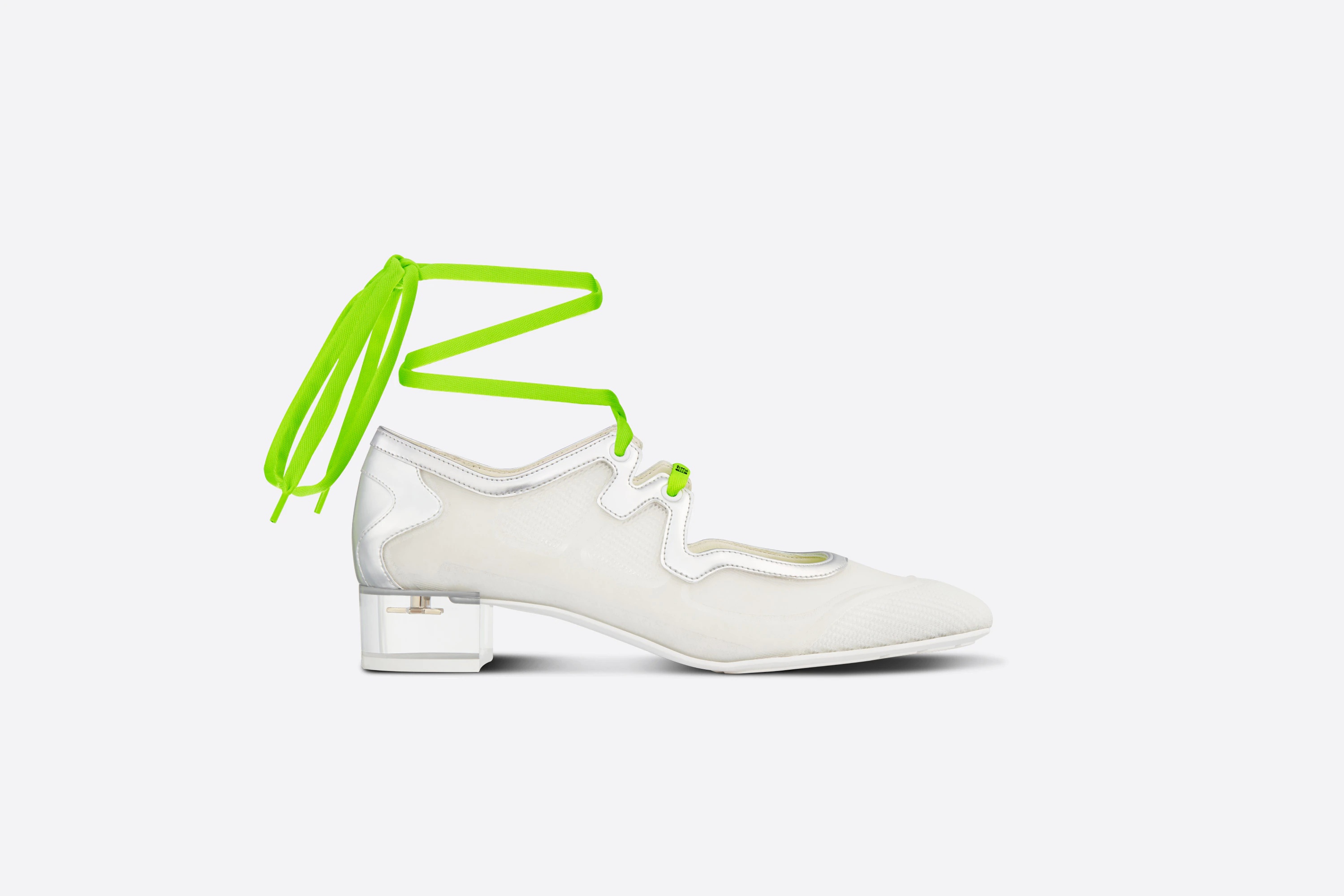 - About the brand: Elegant and timeless French luxury. - Please note: Size selections are European. For US conversions, please reference size chart. - Made in Italy - D-Mension Rubber & Leather Pump in silver leather and transparent rubber with transparent heel and neon laces - Lace-up closure - Lightly padded leather insole - Rubber sole with traction - 1in heel - Please note: All measurements are approximate and were taken from a size 37; slight variations may occur. - Our products are 100% genuine. In some cases we purchase merchandise from trusted independent suppliers and not directly from the brand owner. In all cases we stand by the authenticity of every product sold on our site.