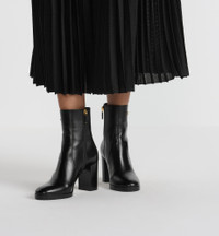 New for Cruise 2025, the D-Town heeled ankle boot is a style with a timeless look. The black calfskin upper is embellished with a gold-finish metal Christian Dior Paris signature on the side. An 8.5-cm (3.5-inch) block heel and a 1-cm (0.5-inch) platform complete the shoe. It will pair with any look throughout the course of the year. - Main composition: calfskin - Calfskin lining - Gold-finish metal Christian Dior Paris signature on the side - Side zip closure - Rubber sole with star, Christian Dior's lucky symbol - Made in Italy Size & Fit - Block heel: 8.5 cm / 3.5 inches and platform: 1 cm / 0.5 inch - The upper is 14.5 cm / 5.5 inches high - The style fits small to size, we recommend ordering a half-size larger than your normal size - Using our personalized tool will provide you with the best size recommendation - For more information, please review the size guide