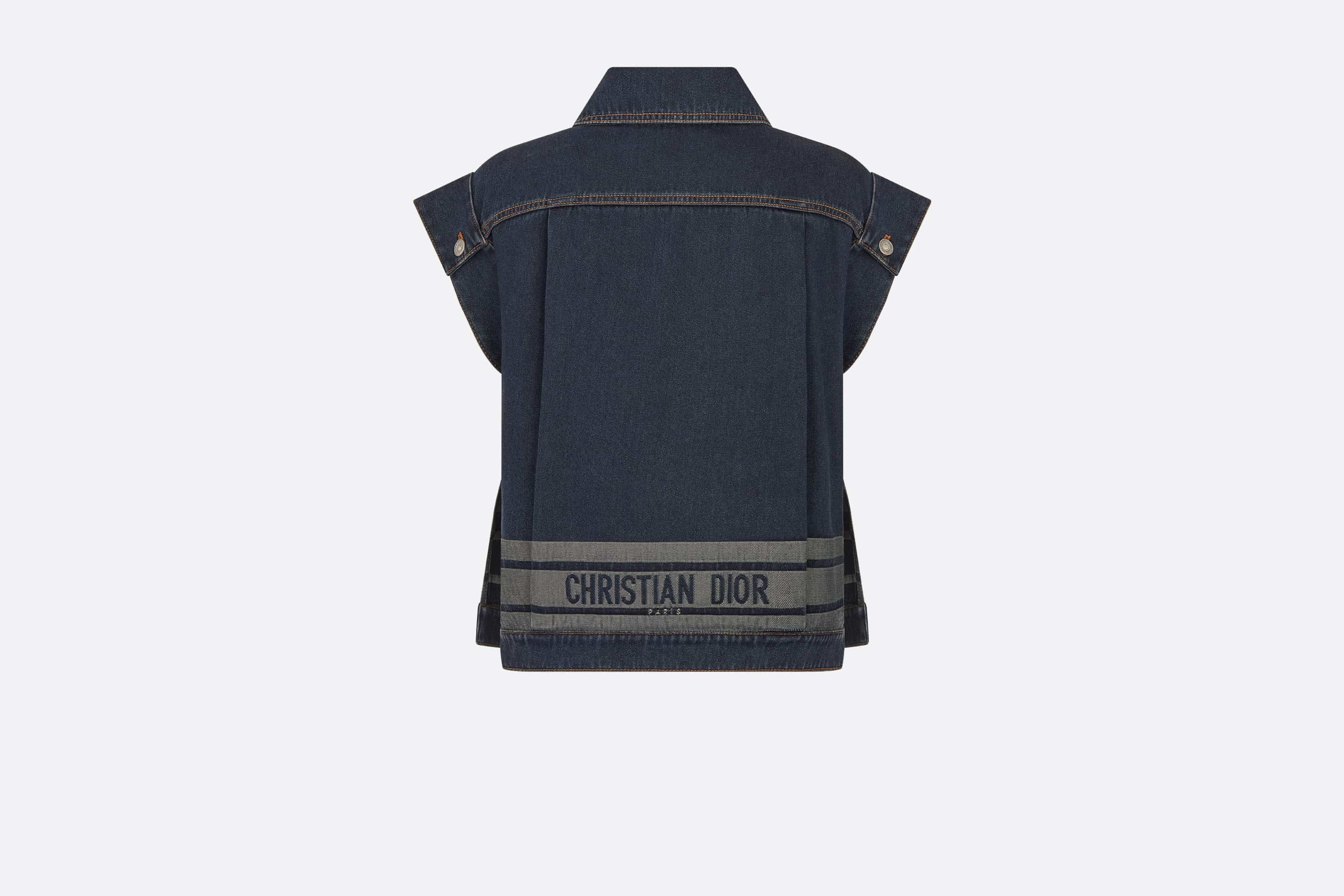 The blue cotton denim jacket reimagines a timeless design in a couture variation. It is distinguished by structured cap sleeves, as well as a contrasting hem and Christian Dior Paris signature on the back. A spread collar, two flap pockets and a button closure complete the design. The jacket can be effortlessly styled with any of the season's looks. - Contrasting Christian Dior Paris signature hem - Embroidered bee emblem - Front button closure - Unlined - 100% cotton - Made in Italy Size & Fit - Cropped cut - Structured cap sleeves - For more information, please review the size guide