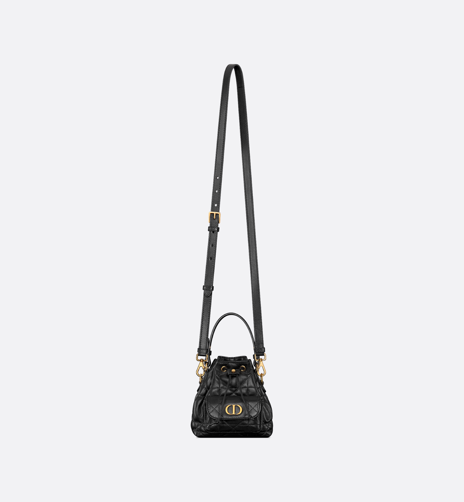 New for Fall 2025, the Dior Caro nano bucket bag embodies modern and elegant style. Crafted in black lambskin elevated by Macrocannage topstitching, the design features a drawstring compartment. The front flap pocket adorned with an antique gold-finish metal CD signature will hold all the small essentials. Thanks to the removable top handle and adjustable, removable strap, the versatile bag can be carried by hand, worn over the shoulder or crossbody. - CD signature on the front - Drawstring closure - Front magnetic flap pocket - Interior slip pocket - Removable leather top handle - Adjustable and removable leather shoulder strap - Dust bag included - Made in Italy Size & Fit - Dimensions: 14 x 15 x 7 cm / 5.5 x 6 x 3 inches (Length x Height x Width) - The size is suitable for a phone, a card holder and lipstick - Strap length: 46 – 54 cm / 18 – 21.5 inches - Top handle drop length: 9 cm / 3.5 inches - Size and weight details may vary depending on the product's material