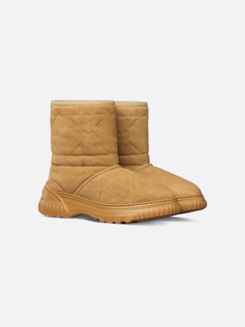 The Dior Frost ankle boot reframes the apres-ski style in a couture variation. The black suede upper showcases the Cannage motif, while the ecru lambskin shearling interior offers optimal comfort. A gold-tone Christian Dior Paris signature on a tonal leather panel highlights the back, while the ultralightweight EVA logo sole completes the comfortable shoe. - Main composition: goatskin and calfskin - Lamb fur, technical fabric and virgin wool lining - Gold-tone Christian Dior Paris signature at the back of the upper - Ecru lambskin shearling interior - Signature rubber sole with star, Christian Dior's lucky symbol - Made in Italy Size & Fit - The upper is 14.5 cm / 5.5 inches high - The style fits true to size, we recommend ordering your normal shoe size - Using our personalized tool will provide you with the best size recommendation - For more information, please review the size guide
