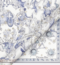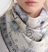 The square scarf showcases Pietro Ruffo's Dior Night of Dreams print, featuring a night sky filled with sea monsters, winged horses and mythological figures, as well as the quote 'Le ciel est la toile des reveurs' (The sky is a canvas for dreamers). The edges are decorated with a frieze depicting the zodiac signs. Crafted in white and blue silk twill, the double-sided style has contrasting rolled edges and is enhanced by the Christian Dior signature. The square scarf can be worn tied around the neck or head to complete a Dior look. - White and blue double-sided Dior Night of Dreams print - Christian Dior signature - Contrasting hand-rolled edges - 100% silk twill - Made in Italy Size & Fit - Dimensions: 90 x 90 cm / 35.5 x 35.5 inches (Length x Width)