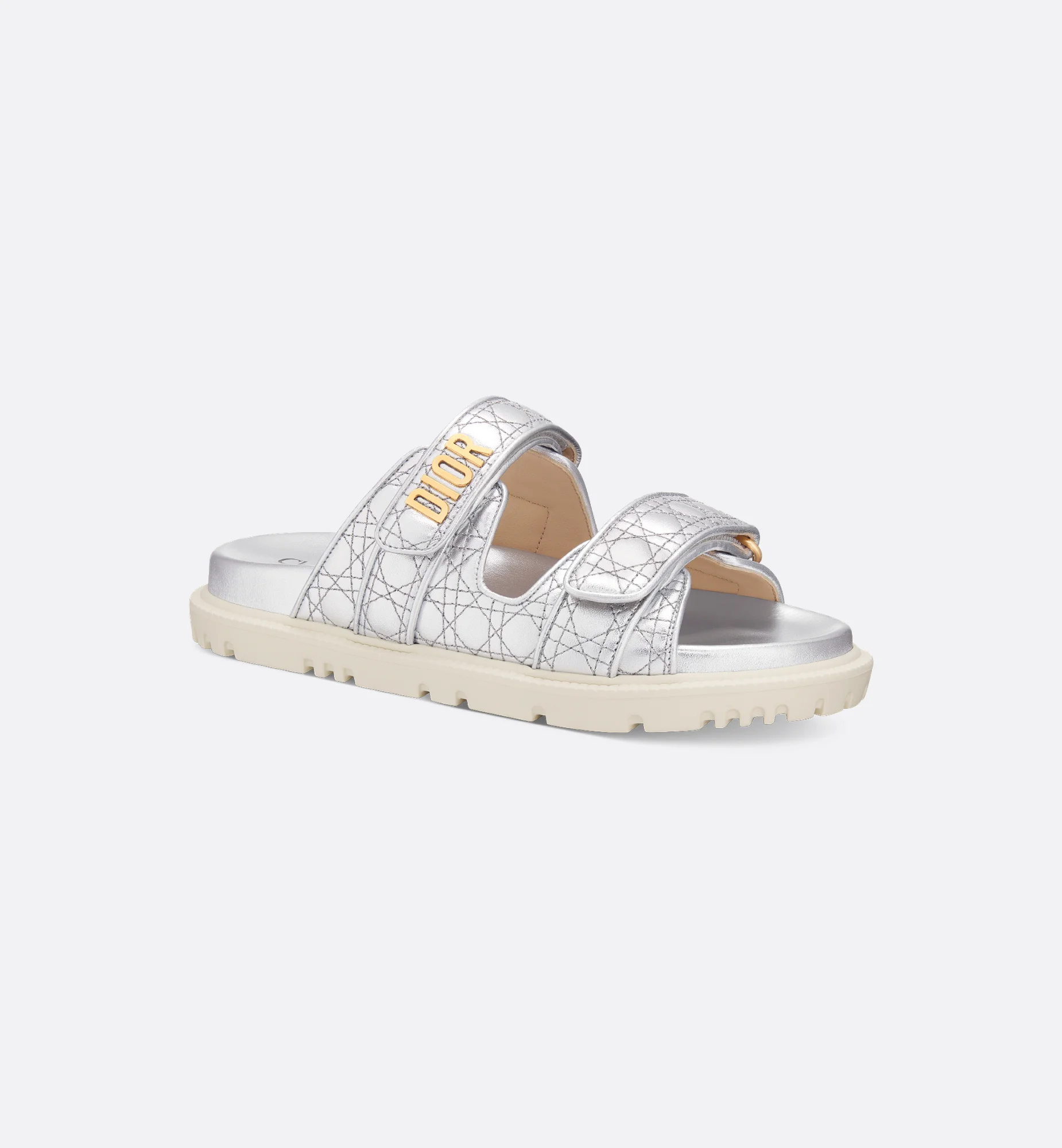 Part of the Dior Or capsule, the Dioract slide presents a modern silhouette in silver-tone laminated sheepskin quilted with the Cannage motif. The style features an anatomically shaped insole made with ultralightweight and comfortable leather. Self-fastening straps further enhanced by a gold-finish metal Dior signature on the upper strap complete the design. The slide will lend a contemporary touch to any look and can be paired with other creations from the Dior Or capsule. - Main composition: sheepskin - Lambskin lining - Gold-finish metal Dior signature - Two adjustable self-fastening straps - Anatomically shaped leather insole - EVA sole with star, Christian Dior's lucky symbol - Made in Italy Size & Fit - The style fits true to size, we recommend ordering your normal shoe size - Weight: 290 g / 10 ounces - Weight details may vary depending on the product's material - Using our personalized tool will provide you with the best size recommendation - For more information, please review the size guide