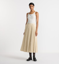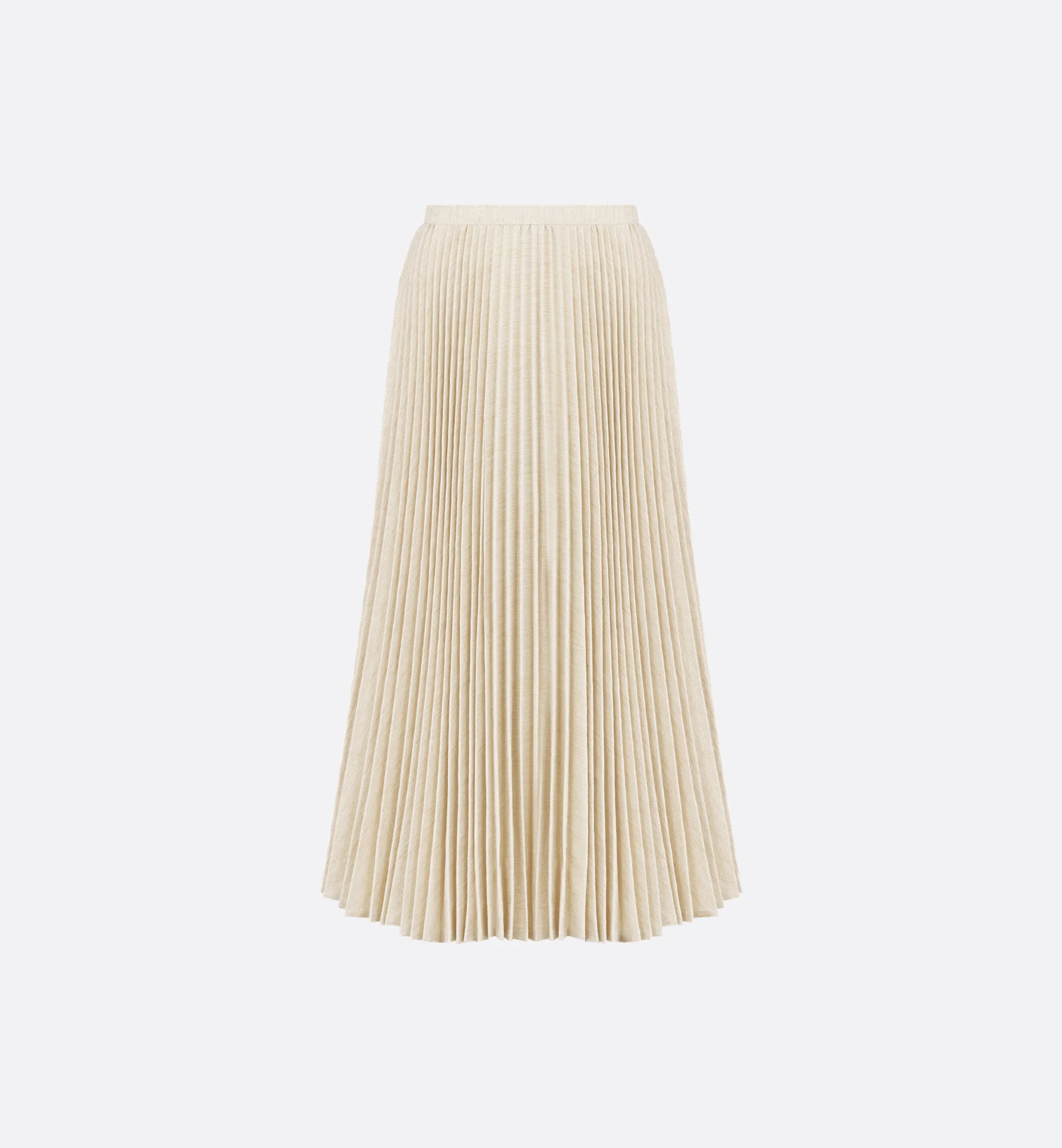 Part of the Dior Or capsule, the mid-length skirt combines elegance and modernity. Crafted in gold-tone cotton-blend denim, it features a flared silhouette and pleats enhanced by the Dior Oblique motif on the interior. The skirt can be paired with other creations from the Dior Or capsule. - Thin waistband - Zip closure with snap on the side - Dior Oblique motif on the interior - Pleated style - Unlined - 62% cotton, 31% viscose, 5% metallic polyester, 2% polyamide - Made in Italy Size & Fit - Flared cut - Mid-length - Using our personalized tool will provide you with the best size recommendation - The model measures 178 cm / 70 inches and the item shown is in size 36 (FR) - For more information, please review the size guide