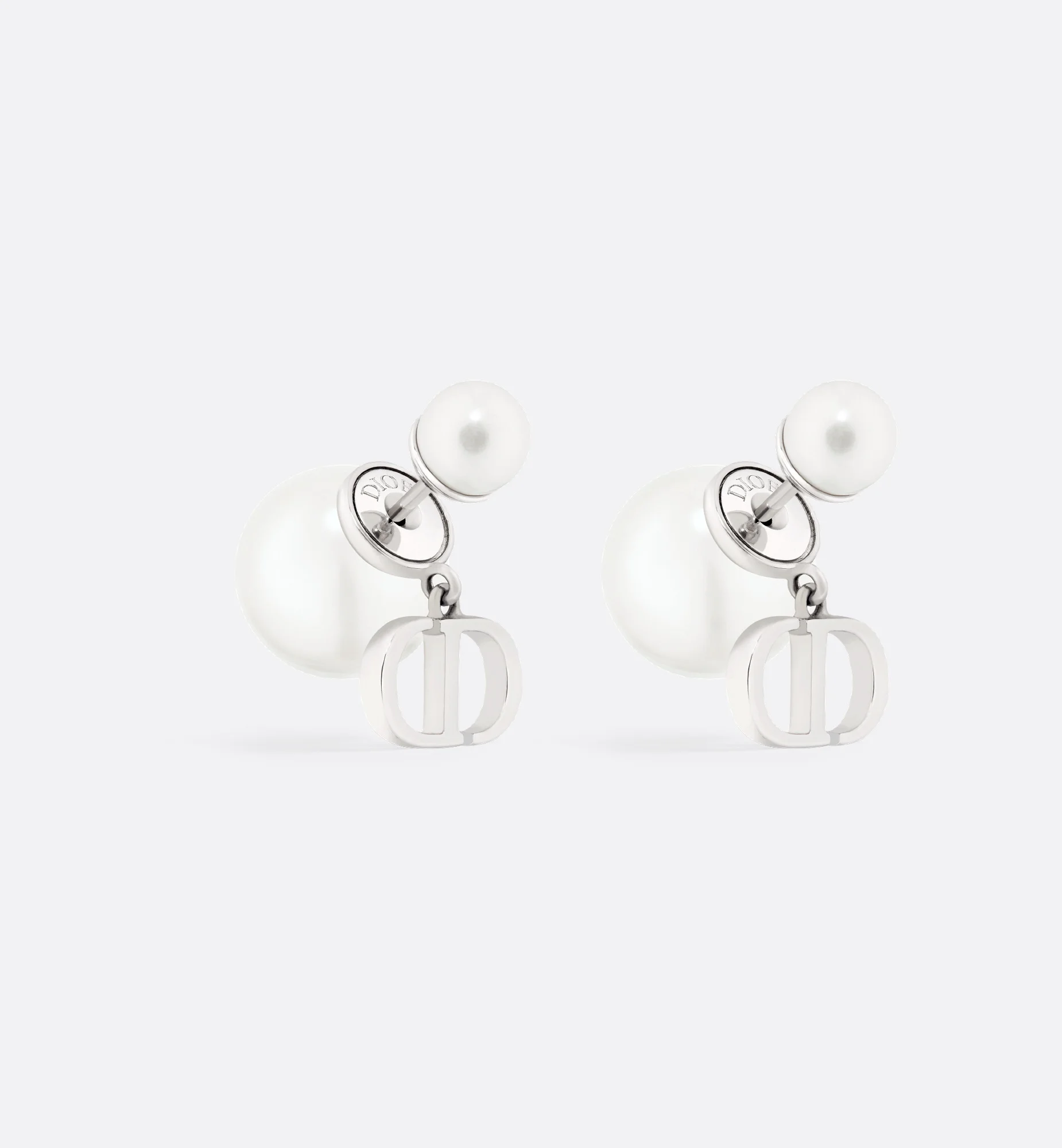 New for Winter 2025, the elegant and graceful Dior Tribales earrings offer a new interpretation of an iconic House style. The hallmark white resin pearls are adorned with the CD signature in silver-finish metal. The delicate and timeless earrings can be paired with creations from the Petit CD line. - White resin pearls - CD signatures - Silver-finish metal - Integrated clasp on the rear pearl - Sold as a pair - Made in Portugal Size & Fit - Earring height: 1.8 cm / 0.75 inch - Resin pearl diameters: 0.6 cm / 0.25 inch and 1.2 cm / 0.5 inch