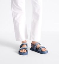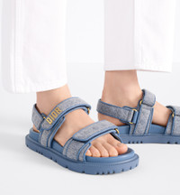 The Dioract sandal presents a modern silhouette revisited in blue denim with Cannage embroidery. The style features an anatomically shaped sole made with lightweight and comfortable leather. Self-fastening straps further enhanced by a gold-finish metal Dior signature on the upper strap complete the design. The sandal will lend a contemporary touch to any look. - Main composition: cotton and lambskin - Lambskin lining - Gold-finish metal Dior signature - Two adjustable self-fastening straps - Anatomically shaped leather insole - Notched EVA sole with star, Christian Dior's lucky symbol - Made in Italy Size & Fit - The style fits true to size, we recommend ordering your normal shoe size - Weight: 200 g / 7 ounces - Using our personalized tool will provide you with the best size recommendation - For more information, please review the size guide