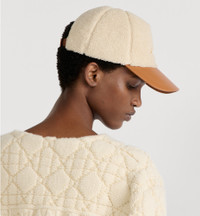 Part of the DiorAlps capsule, the D-Player cap combines the House's couture spirit with sportswear codes. Crafted in ecru shearling effect and camel lambskin, it showcases a gold-finish metal Christian Dior Paris signature on the front. A camel lambskin adjustment tab in the back further enhances the design. The cap will add the finishing touch to relaxed and modern looks. - Gold-finish metal Christian Dior Paris signature on the front - Camel lambskin Christian Dior Paris signature adjustment tab in the back - 68% polyester, 32% acrylic, lining: 100% cotton and visor: 100% lambskin - Made in Italy Size & Fit - The hat size corresponds to the head's circumference in cm / inches - Four sizes available: 56 cm / 22 inches, 57 cm / 22.5 inches, 58 cm / 23 inches, 59 cm / 23.5 inches