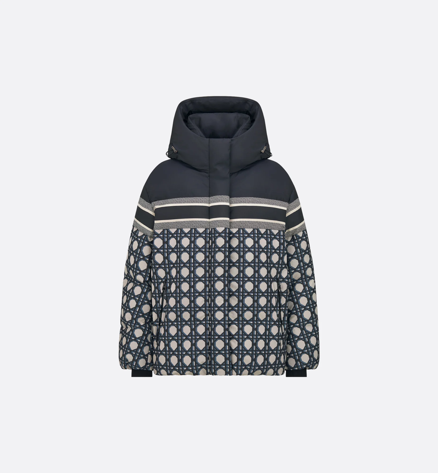 Part of the DiorAlps capsule, the hooded puffer jacket is a functional design with a couture touch. Crafted in blue and white padded technical taffeta with the Macrocannage motif, the waterproof style has a windproof membrane, interior cuffs and multiple pockets making it ideal for skiing. The technical puffer jacket can be worn with other creations from the DiorAlps capsule. - Embroidered hallmark bee and CD signature - Windproof membrane - Concealed front zip closure with snaps - Lining - Filling: 100% polyester - 100% polyester and lining: 100% polyester - Made in Italy Size & Fit - Relaxed fit - Long sleeves - Using our personalized tool will provide you with the best size recommendation - For more information, please review the size guide