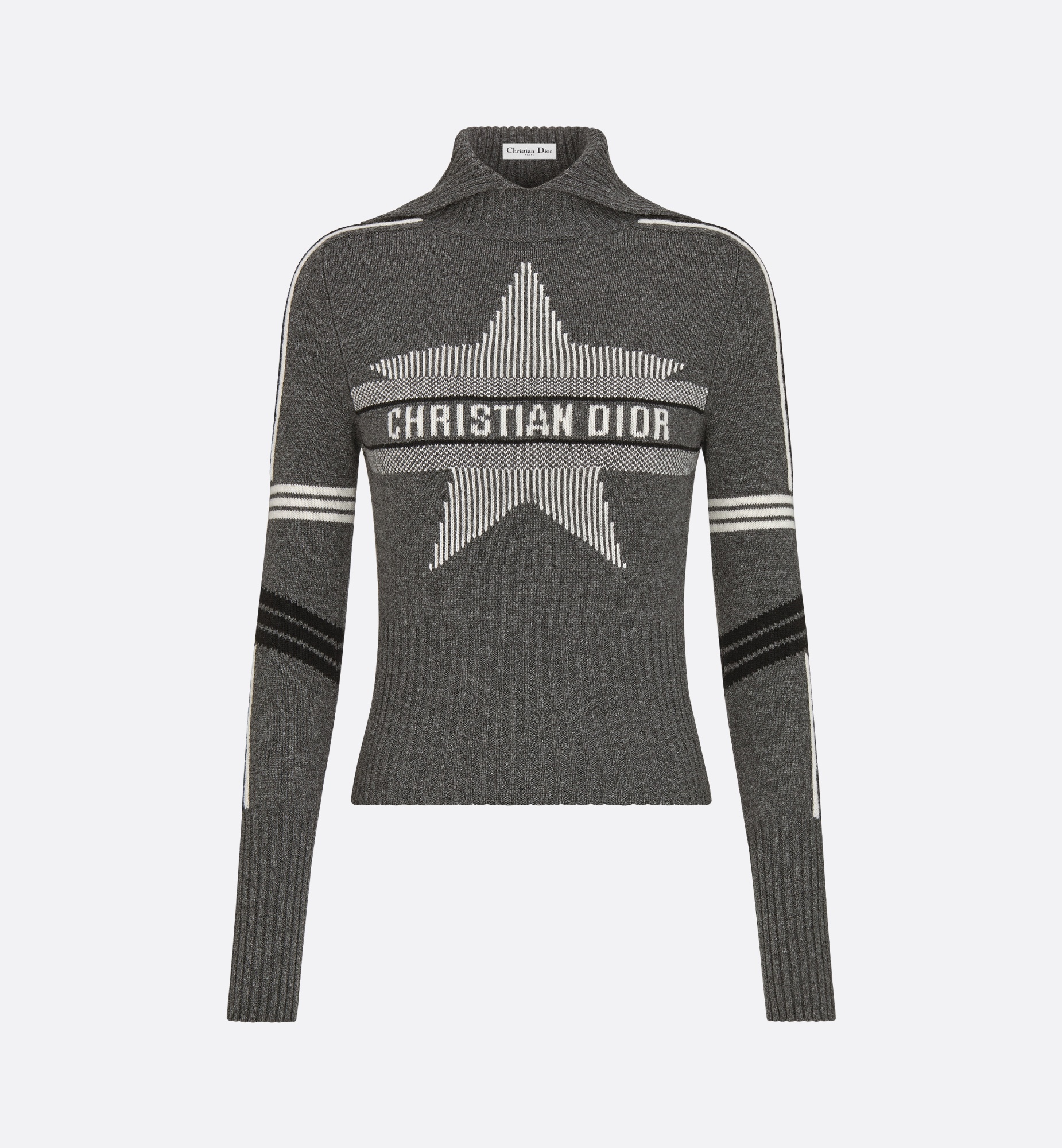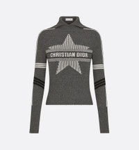 Part of the DiorAlps capsule, the mock neck sweater reimagines the winter sports universe with the House's couture codes. Crafted in a gray virgin wool and cashmere knit, it features a white Dior Star motif showcasing the Christian Dior signature. Fitted at the waist, the sweater can be coordinated with other DiorAlps creations to complete the look. - Christian Dior signature - Ribbed collar, cuffs and hem - 70% virgin wool, 30% cashmere (5 gauge)* - Made in Italy - Treat with extra care and gently dry clean Size & Fit - Slightly cropped fit - Stretch ribbing around waist - Long sleeves - Using our personalized tool will provide you with the best size recommendation - For more information, please review the size guide
