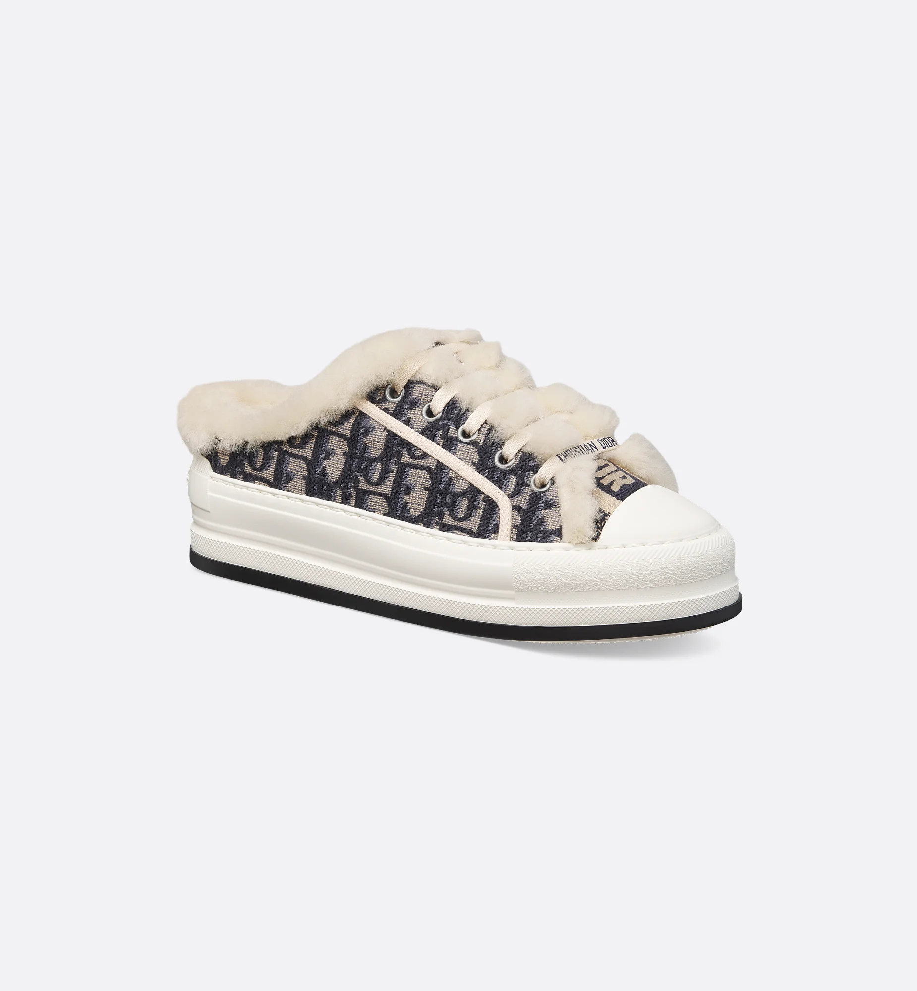 Part of the DiorAlps capsule, the Walk'n'Dior platform sneaker enhances the line with a modern, backless creation. The deep blue Dior Oblique embroidered cotton upper is enhanced by white lambskin shearling lining. The style features the Christian Dior Paris signature on the comfortable and ultralightweight thick sole, tongue and laces. The sneaker can be paired with other DiorAlps creations. - Main composition: cotton, lambskin shearling and technical fabric - Lambskin shearling-effect and lambskin lining - Signatures on the tongue, sole and laces - EVA platform with star, Christian Dior's lucky symbol - Made in Italy - Additional set of laces provided Size & Fit - Platform: 4.5 cm / 2 inches - The style fits large, we recommend ordering a half size smaller than your normal size - For those with wider feet, we recommend ordering your normal size - Weight: 415 g / 14.5 ounces - Weight details may vary depending on the product's material - For more information, please review the size guide