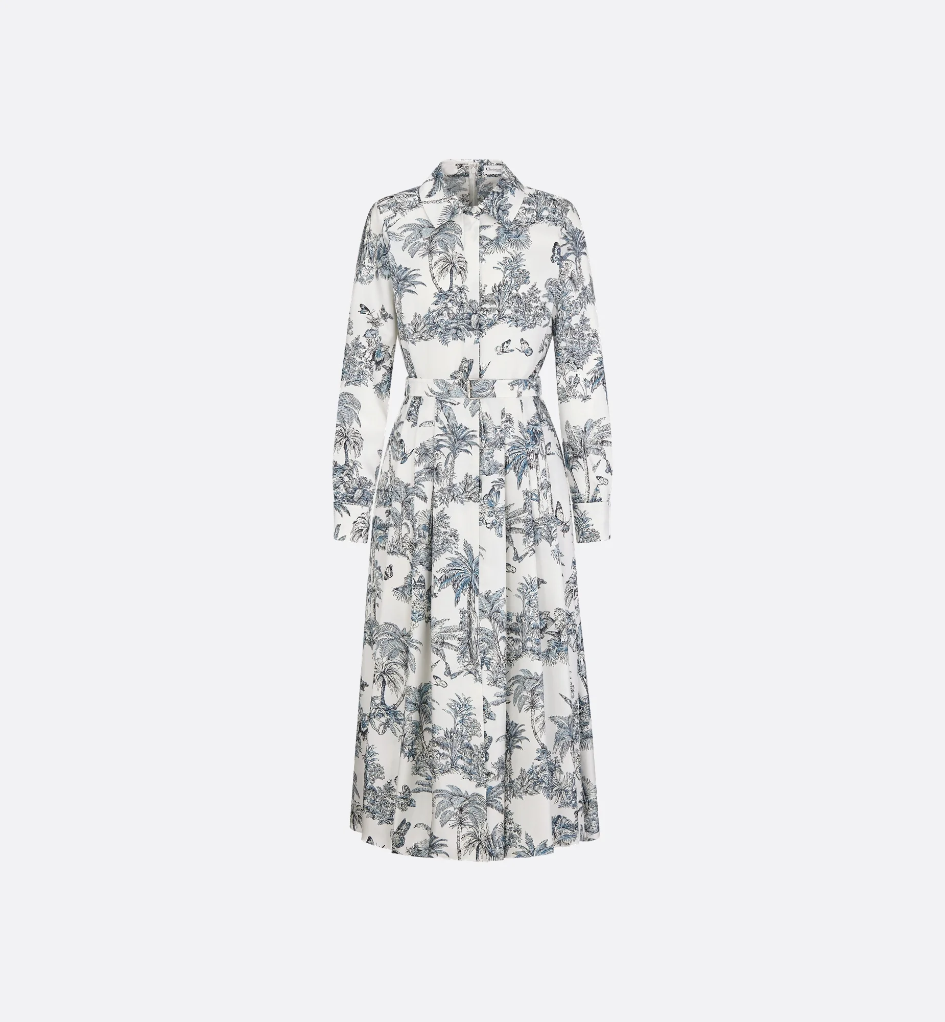 Part of the Dioriviera capsule, the shirtdress showcases Pietro Ruffo's Toile de Jouy Palms motif, capturing the beauty of nature with a vibrant jungle scene populated with diverse wildlife. Crafted in white and blue silk twill, it features a flared silhouette enhanced by a concealed button closure, while a tonal belt delicately highlights the waist. The long-sleeved shirtdress can be coordinated with other Toile de Jouy Palms creations to complete a Dioriviera look. - Tonal belt with metal buckle - Concealed front button closure - Buttoned cuffs - Christian Dior Paris mother-of-pearl buttons - Unlined - 100% silk - Made in Italy Size & Fit - Flared cut - Mid-length - Long sleeves - Using our personalized tool will provide you with the best size recommendation - For more information, please review the size guide