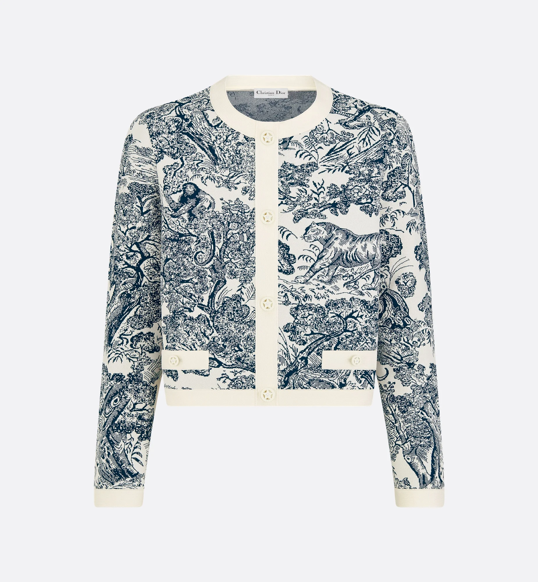 Part of the Dioriviera capsule, the jacket highlights a deep blue and white Toile de Jouy Sauvage motif, offering a new take on the iconic House pattern. Crafted in a technical knit, it is distinguished by a regular fit enhanced by star buttons. The jacket can be styled with the matching skirt to complete a Dioriviera look. - Front button closure - Buttons decorated with a star - Buttoned cuffs - Unlined - 83% viscose, 17% polyester (18 gauge)* - Made in Italy - Treat with extra care and gently dry clean Size & Fit - Cropped regular fit - Long sleeves - Using our personalized tool will provide you with the best size recommendation - For more information, please review the size guide