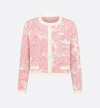 Part of the Dioriviera capsule, the jacket highlights a white and cherry blossom pink Toile de Jouy Sauvage motif, offering a new take on the iconic House pattern. Crafted in technical knit, it is distinguished by a regular fit enhanced by star buttons. The jacket can be styled with the matching skirt to complete a Dioriviera look. - Front button closure - Buttons decorated with a star - Buttoned cuffs - Unlined - 83% viscose, 17% polyester (18 gauge)* - Made in Italy - Treat with extra care and gently dry clean Size & Fit - Cropped regular fit - Long sleeves - Using our personalized tool will provide you with the best size recommendation - For more information, please review the size guide