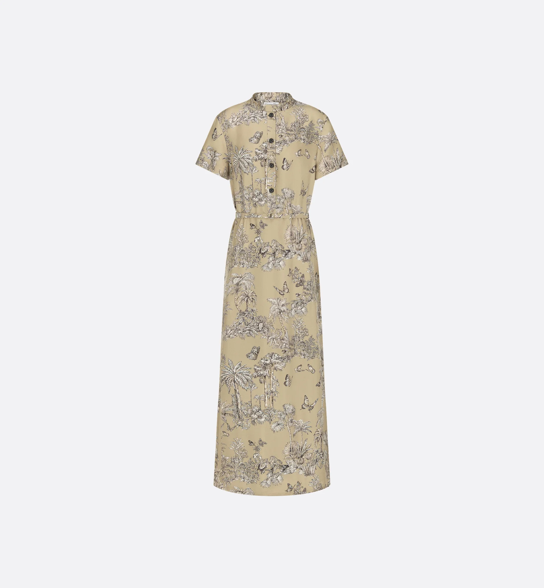 Part of the Dioriviera capsule, the long shirtdress showcases Pietro Ruffo's Toile de Jouy Palms motif, capturing the beauty of nature with a vibrant jungle scene populated by diverse wildlife. Crafted in hazelnut and white silk twill, it has a fluid silhouette enhanced by an officer collar, tonal belt highlighting the waist and side slit pockets. The short-sleeved shirtdress can be worn with other Dioriviera creations to complete the look. - Tonal belt - Front button closure - Christian Dior Paris horn buttons - Unlined - 100% silk - Made in Italy Size & Fit - Regular fit - Long silhouette - Short sleeves - Using our personalized tool will provide you with the best size recommendation - For more information, please review the size guide