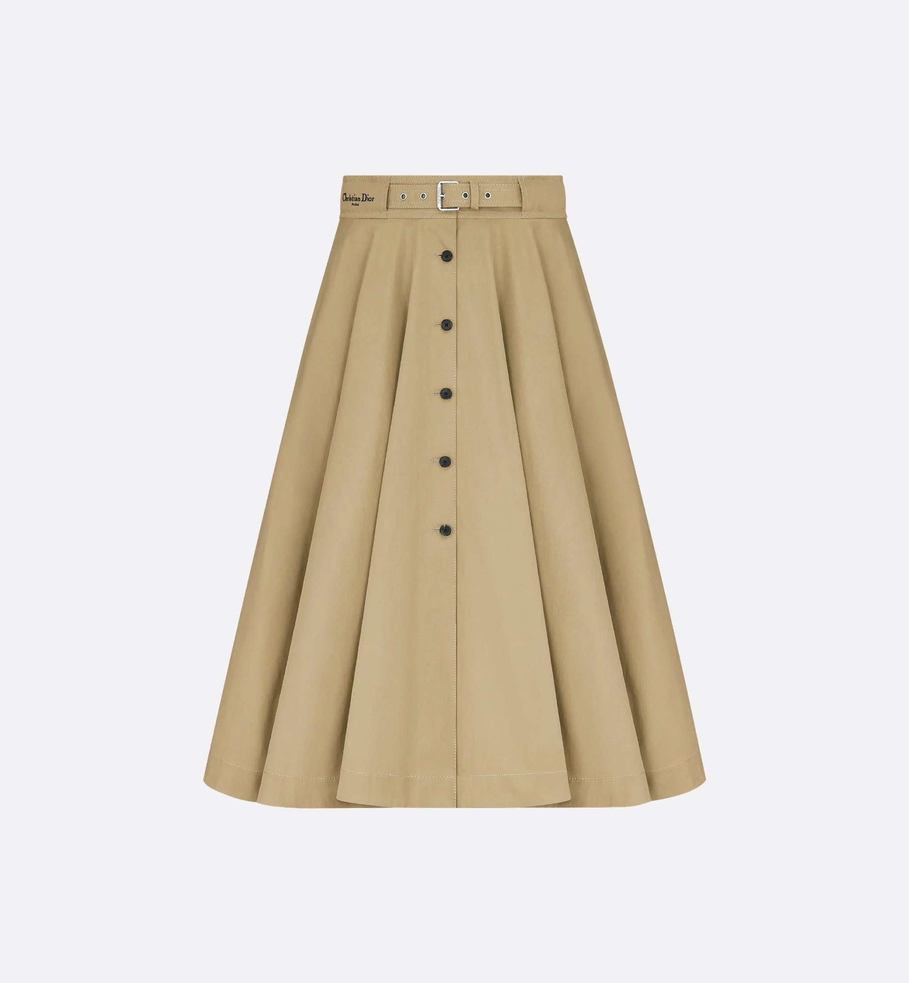 Part of the Dioriviera capsule, the mid-length skirt embodies the House's vision of laid-back elegance. Crafted in beige cotton gabardine, it features a flared silhouette enhanced by the Christian Dior Paris signature and a tonal belt highlighting the waist, as well as a front button closure. The skirt will pair with other capsule creations to complete a Dioriviera look. - Christian Dior Paris signature at the waist - Tonal belt with metal buckle - Front button closure - Christian Dior Paris horn buttons - Unlined - 100% cotton - Made in Italy Size & Fit - Flared cut - High waist - Mid-length - The model measures 178 cm / 70 inches and the item shown is in size 36 (FR) - Using our personalized tool will provide you with the best size recommendation - For more information, please review the size guide