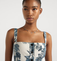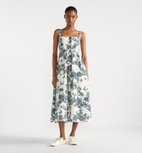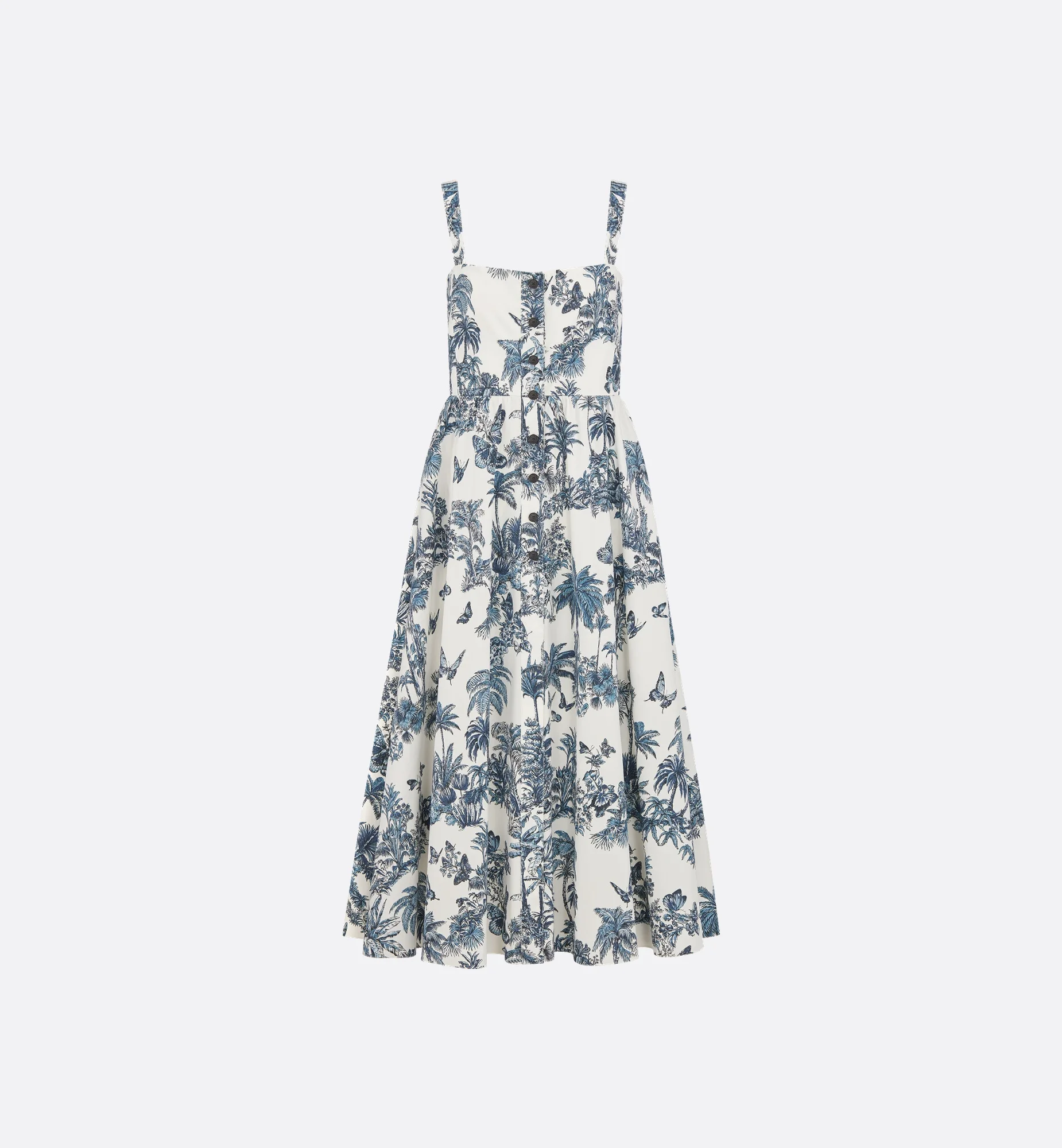 Part of the Dioriviera capsule, the mid-length dress showcases Pietro Ruffo's Toile de Jouy Palms motif, capturing the beauty of nature with a vibrant jungle scene populated with diverse wildlife. Crafted in white and blue cotton and silk poplin, it features a flared silhouette enhanced by a square neckline and a button closure, while subtle gathers highlight the waist. The dress can be coordinated with other Toile de Jouy Palms creations to complete a Dioriviera look. - Front button closure - Christian Dior Paris horn buttons - Unlined - 71% cotton, 29% silk - Made in Italy Size & Fit - Flared cut - Mid-length - Sleeveless - The model measures 178 cm / 70 inches and the item shown is in size 36 (FR) - Using our personalized tool will provide you with the best size recommendation - For more information, please review the size guide