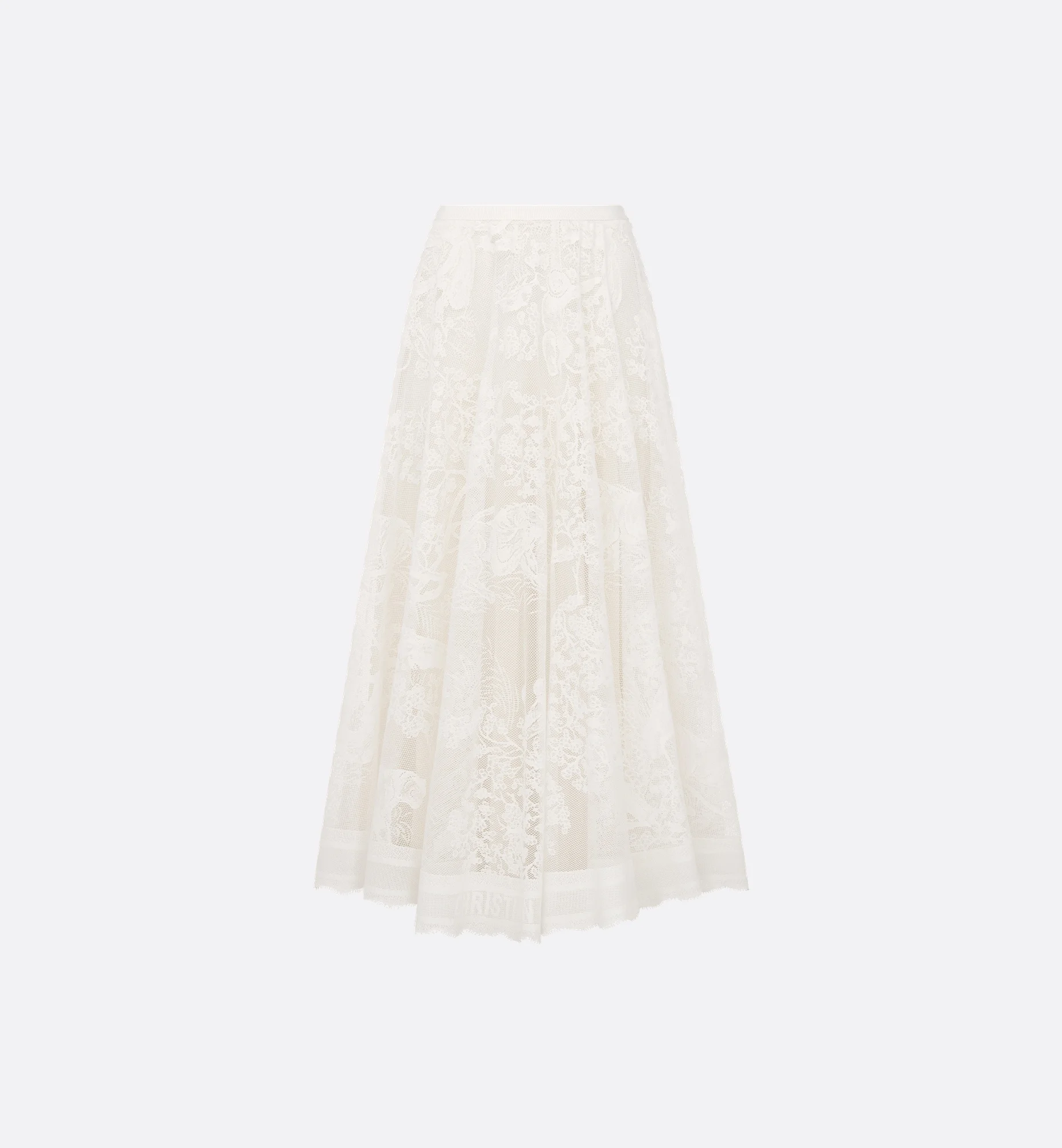 Part of the Dioriviera capsule, the mid-length skirt presents the Toile de Jouy Sauvage motif, a new take on the House's hallmark pattern. Made in ecru cotton-blend lace, it is distinguished by a gracefully flared cut. The mid-length skirt can be paired with other Dioriviera creations to complete the look. - Thin waistband - Side zip closure - Removable tonal lining - 68% cotton, 32% polyamide - Made in Italy Size & Fit - Flared cut - High waist - Mid-length - The model measures 177 cm / 69.5 inches and the item shown is in size 36 (FR) - Using our personalized tool will provide you with the best size recommendation - For more information, please review the size guide